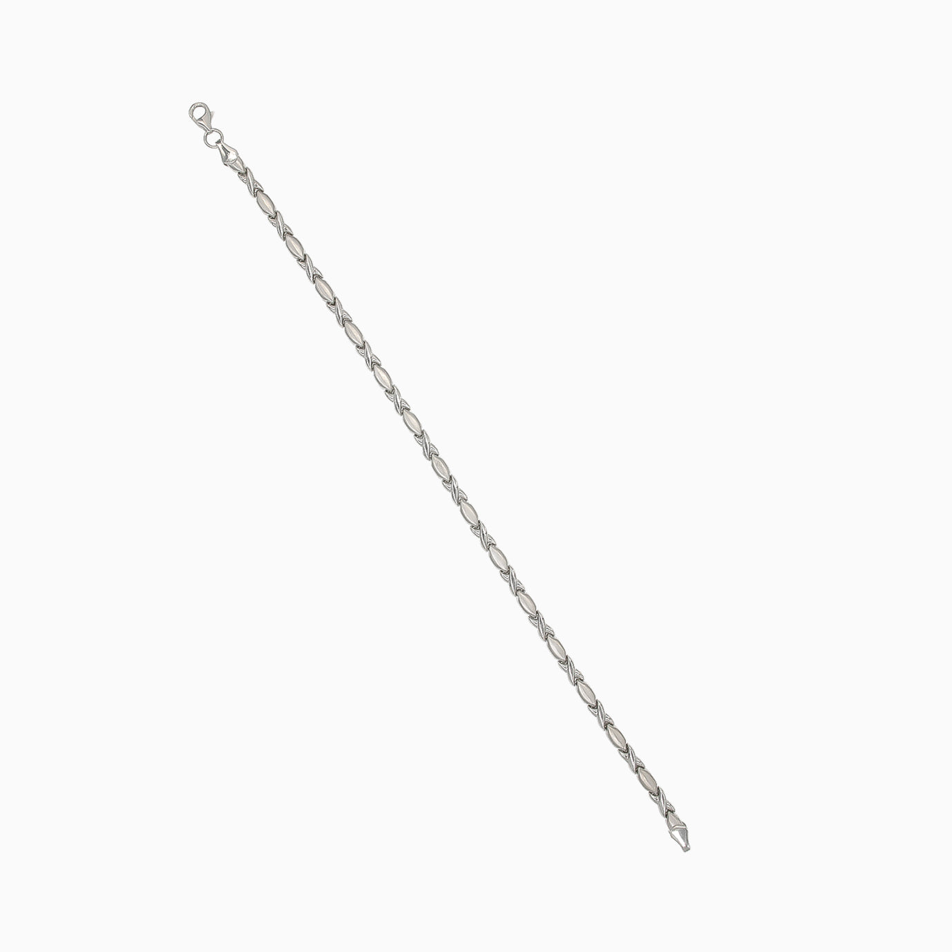Dieses elegante Armband ist aus 14kt Weißgold gefertigt. Es besticht durch ein einzigartiges Design mit ineinandergreifenden, hochglanzpolierten und matten Gliedern. Für Komfort und Sicherheit sorgt ein Karabinerverschluss.