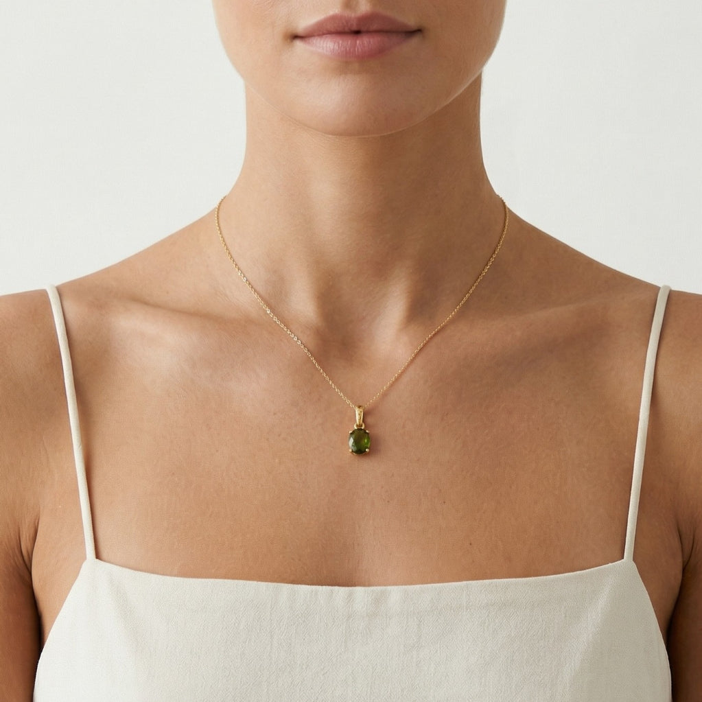 Anhänger aus 14kt Gelbgold mit Moldavit im ovalen Facettenschliff. 4er-Krappenfassung betont natürliche Schönheit und Eleganz.