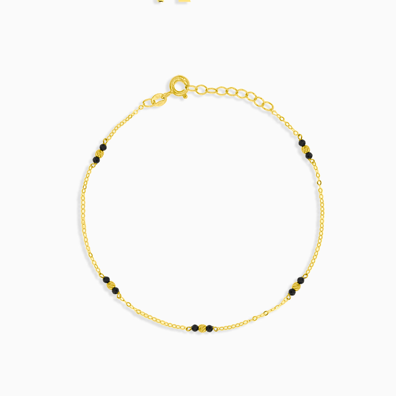 Verleihen Sie Ihrem Handgelenk einen Hauch von Raffinesse. Gefertigt aus 14kt Gelbgold, zeigt dieses zarte Kettenarmband kleine Onyx-Perlen, ergänzt durch diamantgeschliffene Goldperlen. Das Armband wird mit einem Federringverschluss sicher verschlossen, um ein einfaches Anlegen zu ermöglichen.