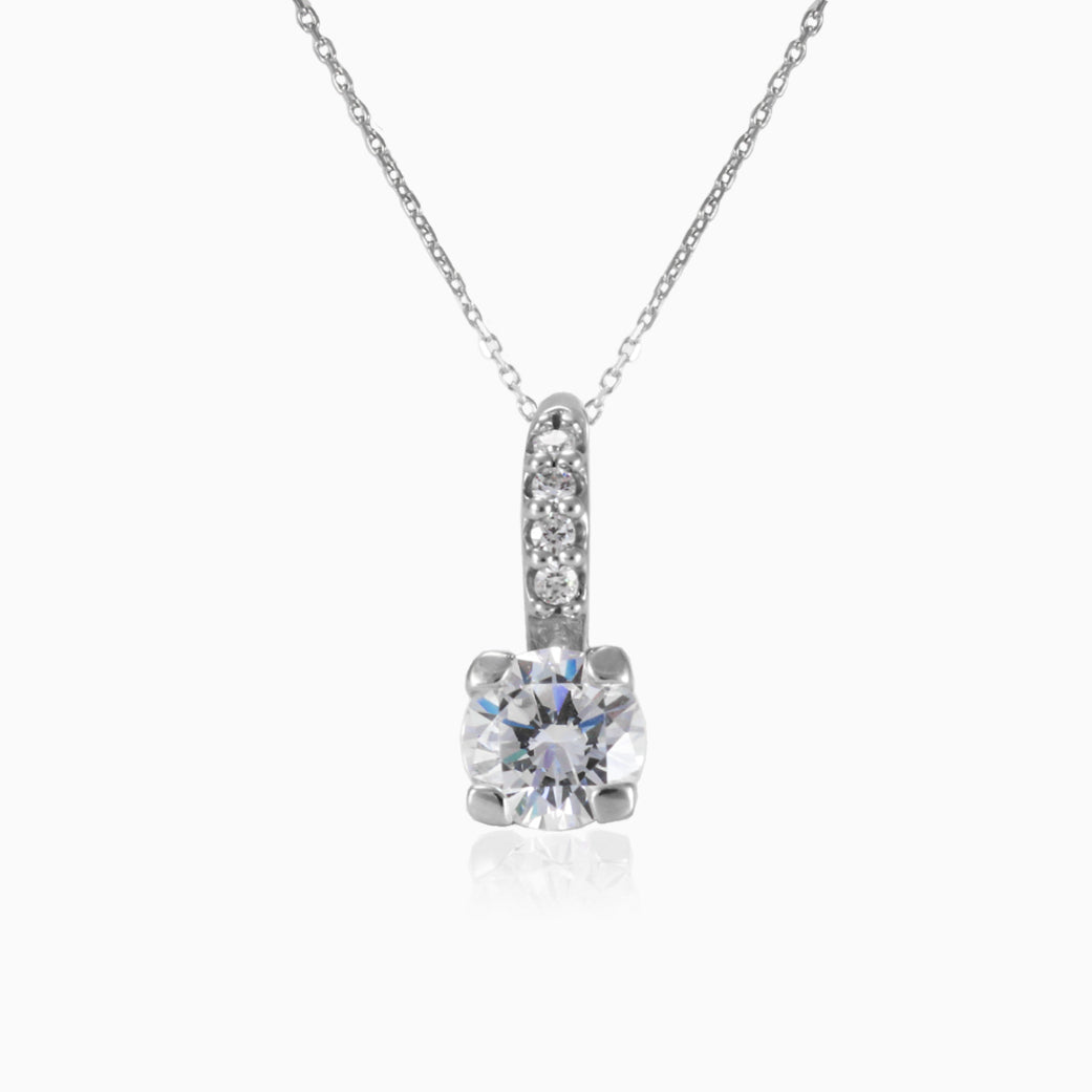 14kt-Weißgold-Anhänger mit großem zentralem Zirkonia, gehalten von vier goldenen Krappen, und fünf kleinen Kristallen, die vorne an der Anhängeröse eingefasst sind.