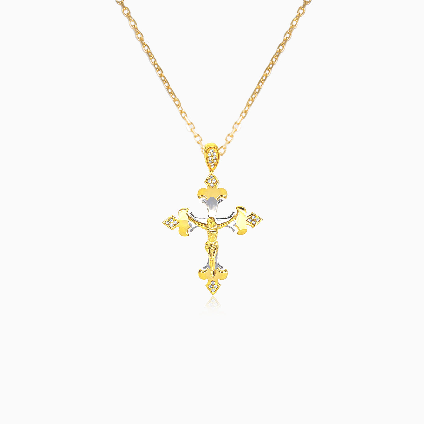 Dieser Anhänger ist sorgfältig aus 14 Karat Gelb- und Weißgold gefertigt und zeigt in der Mitte eine detaillierte Darstellung von Jesus Christus vor einem Weißgold-Hintergrund. Zirkonia schmücken die scharfen Kanten des Kreuzes und den oberen Teil des Kettenanhängers. Die Kette ist nicht enthalten.
