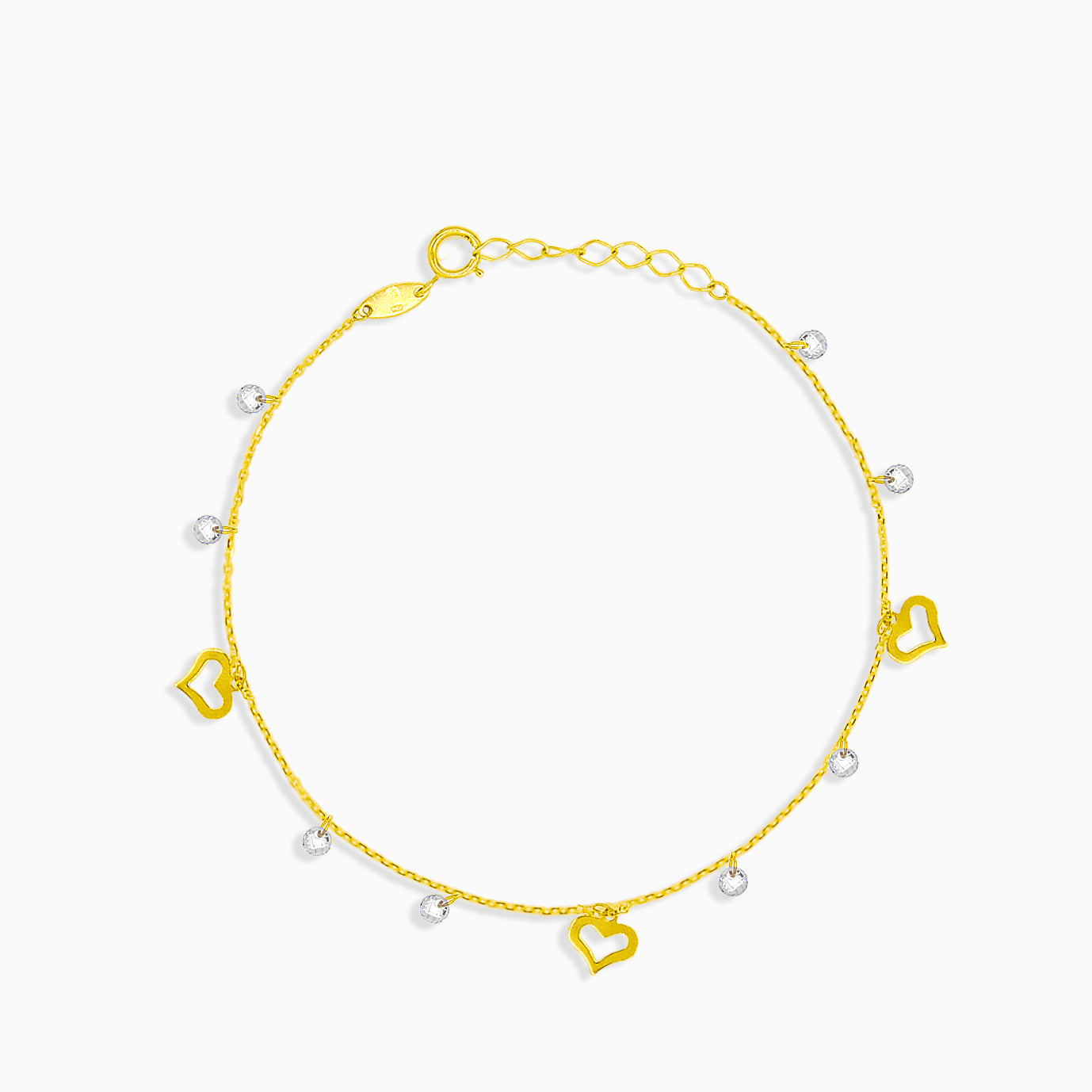 Heben Sie Ihr Handgelenk mit diesem zarten Kettenarmband aus 14 Karat Gelbgold hervor, verziert mit herzförmigen Anhängern und brillantgeschliffenen Zirkoniasteinen. Das Armband ist mit einem Federringverschluss ausgestattet, um sicheren Halt zu gewährleisten.