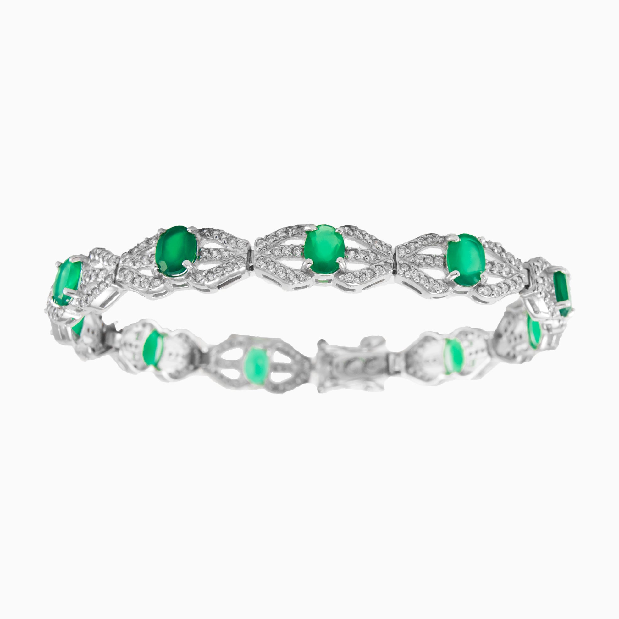 Klassisches Armband aus Sterlingsilber mit ovalen Jades und kubischen Zirkonias. Für Liebhaber des klassischen Stils.