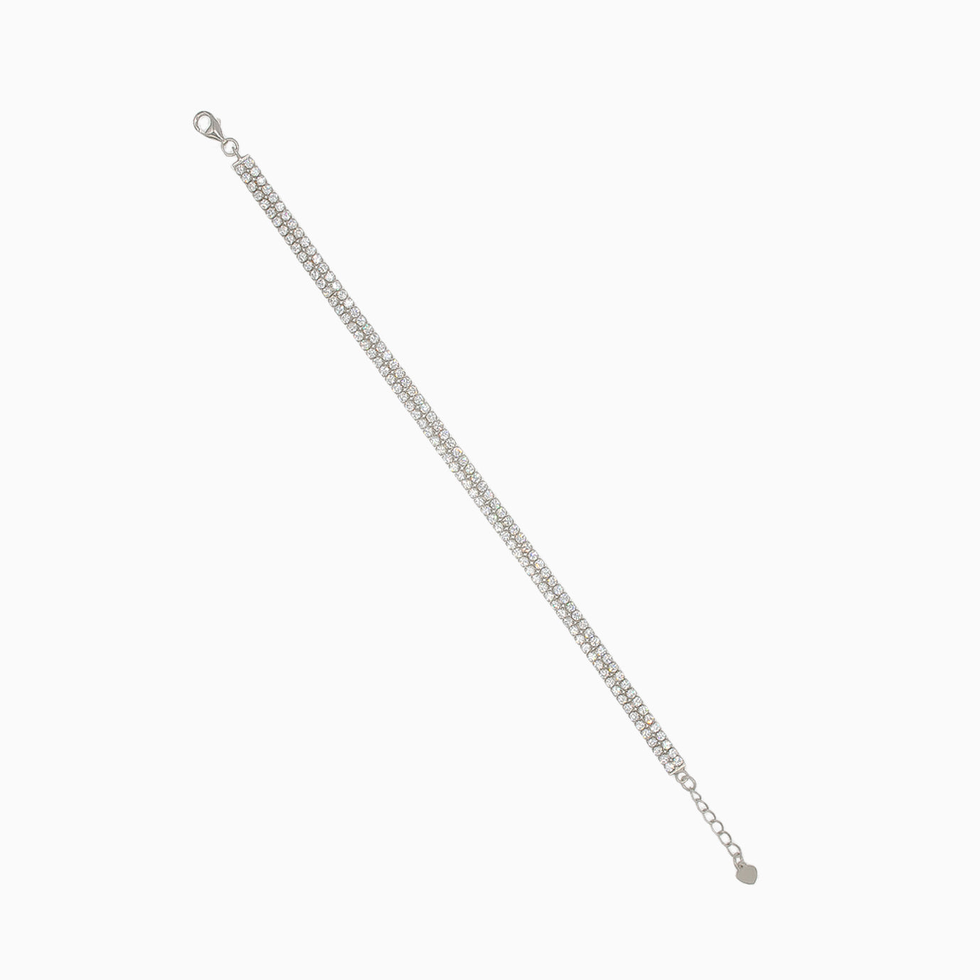 Tennisarmband aus Silber, verziert mit zwei Zirkonreihen. Es bietet eine verstellbare Länge von 17 - 19 cm und endet mit einem charmanten Herzanhänger. Sicher verschlossen mit einem Karabinerverschluss.