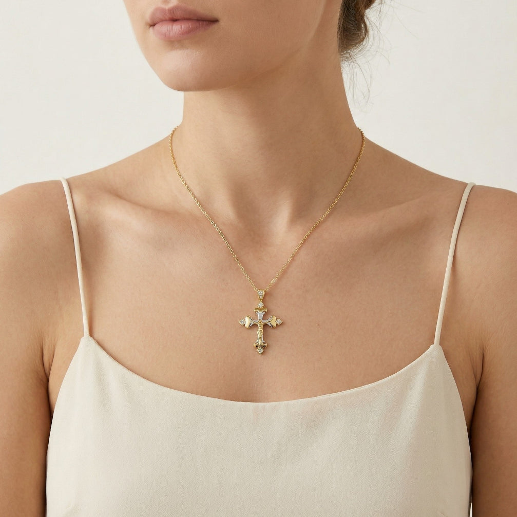 Dieser Anhänger ist sorgfältig aus 14 Karat Gelb- und Weißgold gefertigt und zeigt in der Mitte eine detaillierte Darstellung von Jesus Christus vor einem Weißgold-Hintergrund. Zirkonia schmücken die scharfen Kanten des Kreuzes und den oberen Teil des Kettenanhängers. Die Kette ist nicht enthalten.
