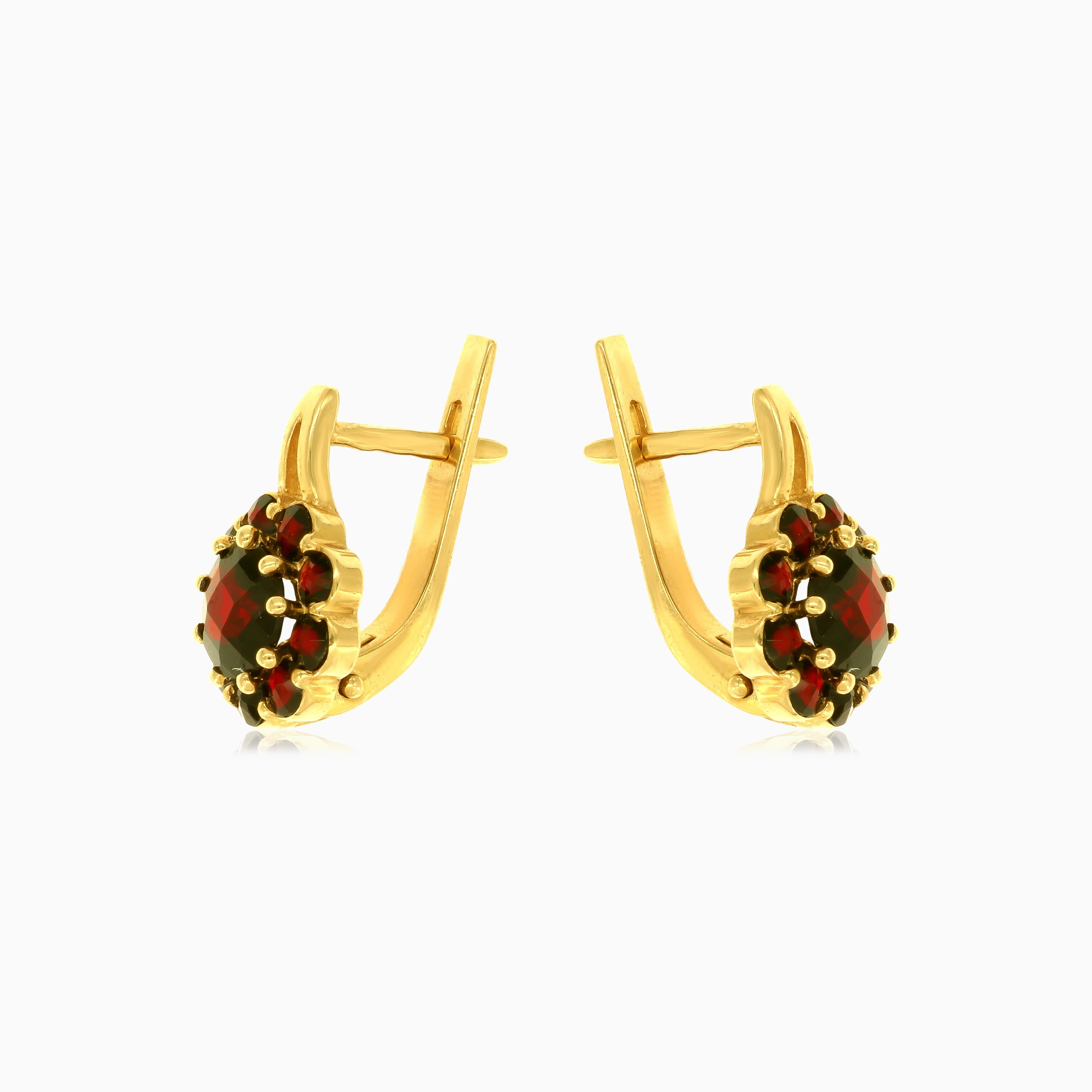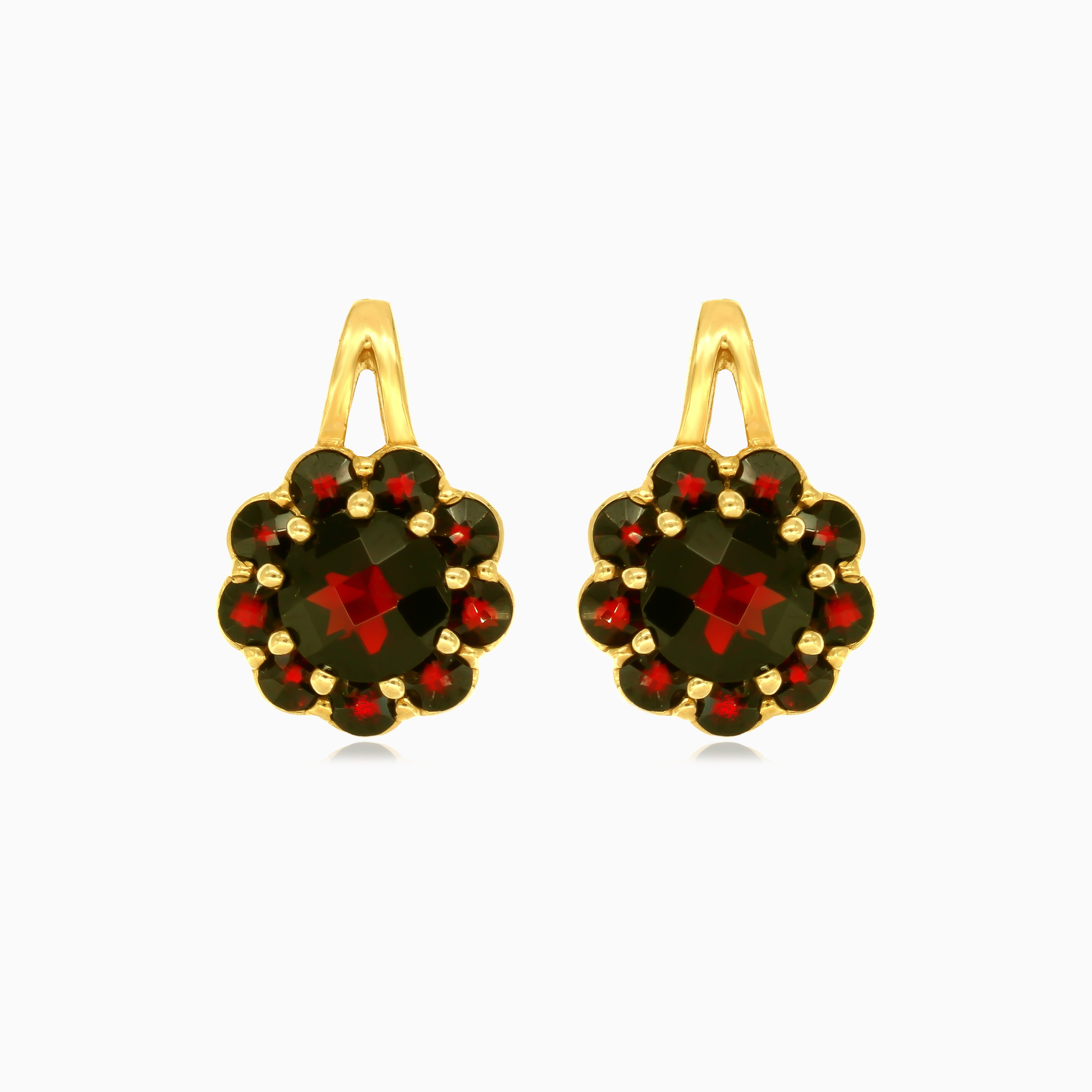 Genießen Sie die florale Anziehungskraft mit diesen 14 Karat Gelbgold-Ohrringen, die einen runden, fein im Treppenschliff geschliffenen Granat in einer geteilten Krappenfassung zeigen. Der filigrane Klappbügelverschluss sorgt für sicheren Halt und macht diese Ohrringe zu einem blühenden Ausdruck von Eleganz.