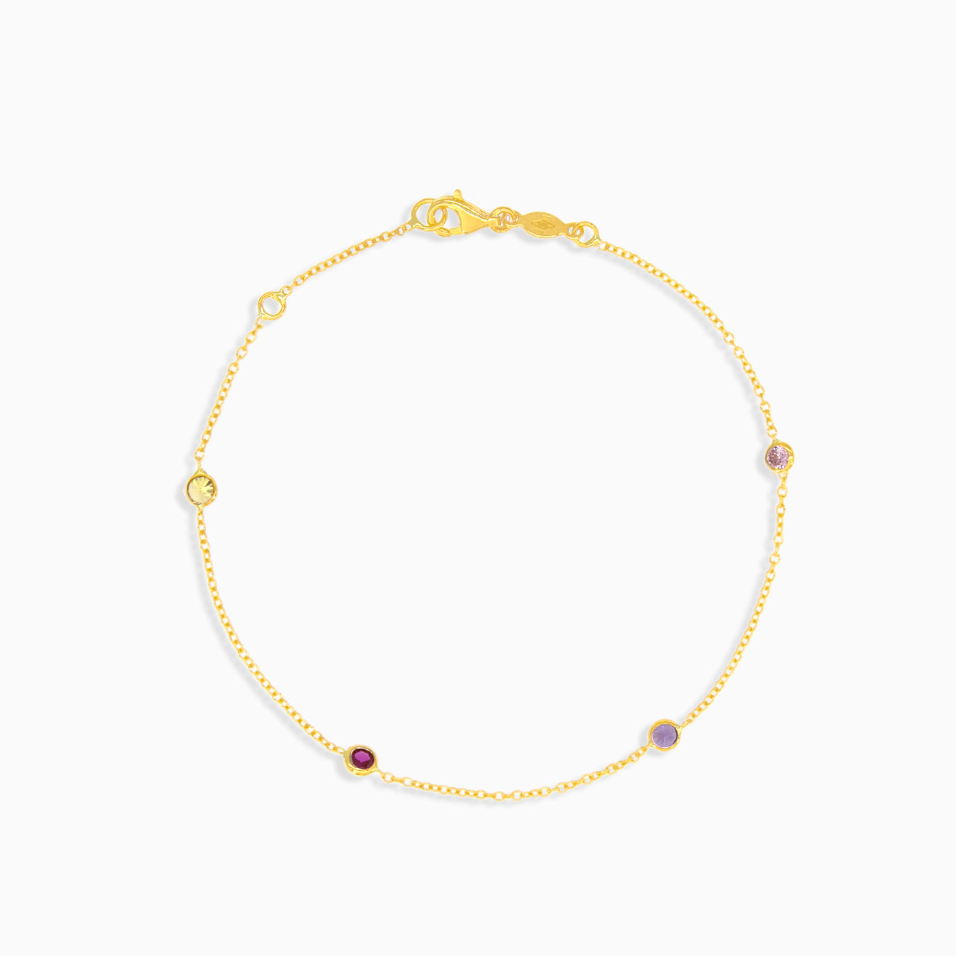Heben Sie Ihren Stil hervor mit einem 14 Karat Gelbgold-Kettenarmband, das mit vier lebhaften, farbigen Zirkonia-Steinen verziert ist. Das Armband ist mit einem Karabinerverschluss gesichert.