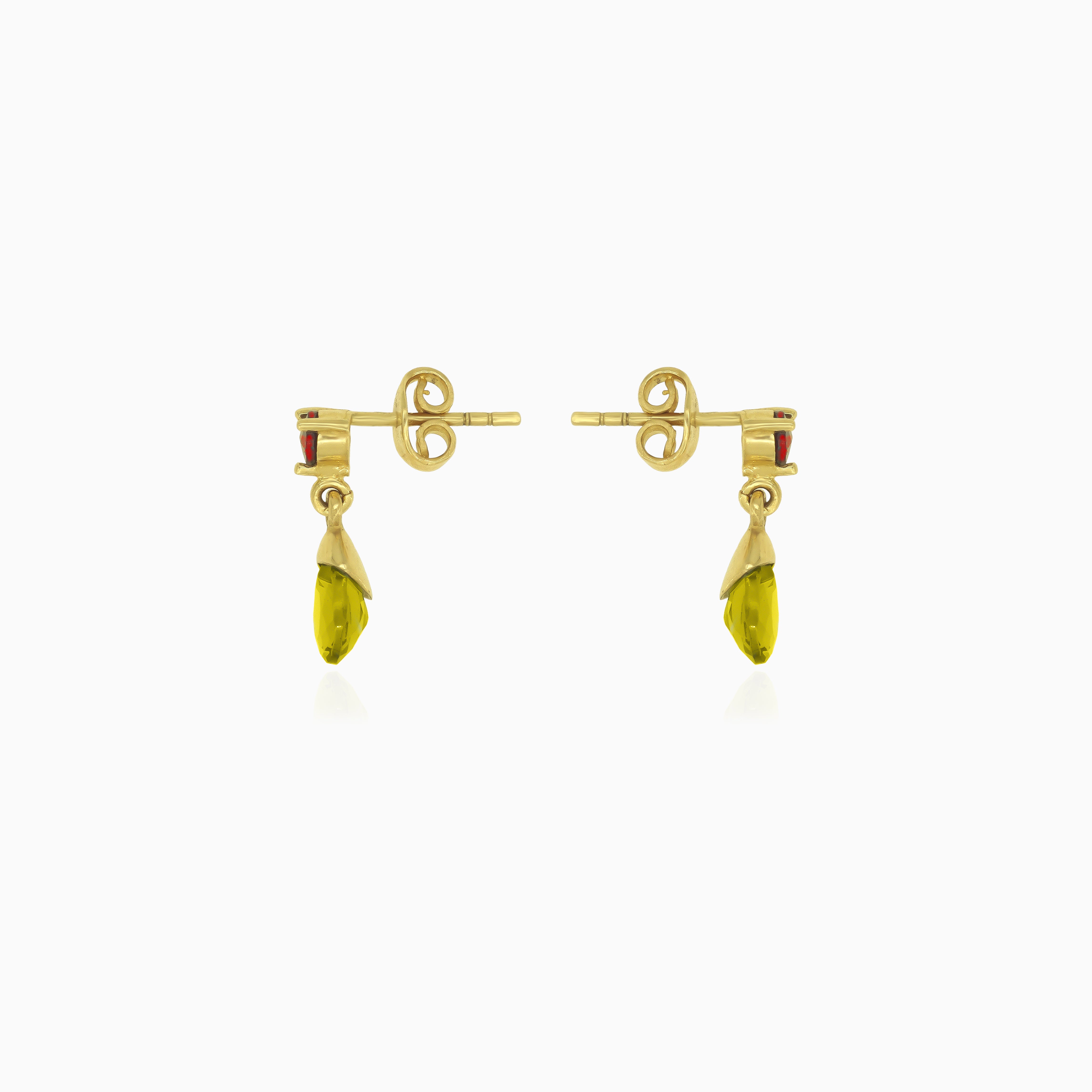 Verleihe deinem Stil das gewisse Etwas mit diesen 14 Karat Gelbgold-Tropfenohrringen, die eine atemberaubende Kombination aus runden, fein facettierten Granaten und Moldavit-Brioletten im Birnenschliff zeigen. Die Krappenfassung und der Pousette-Verschluss sorgen sowohl für Eleganz als auch für Sicherheit.