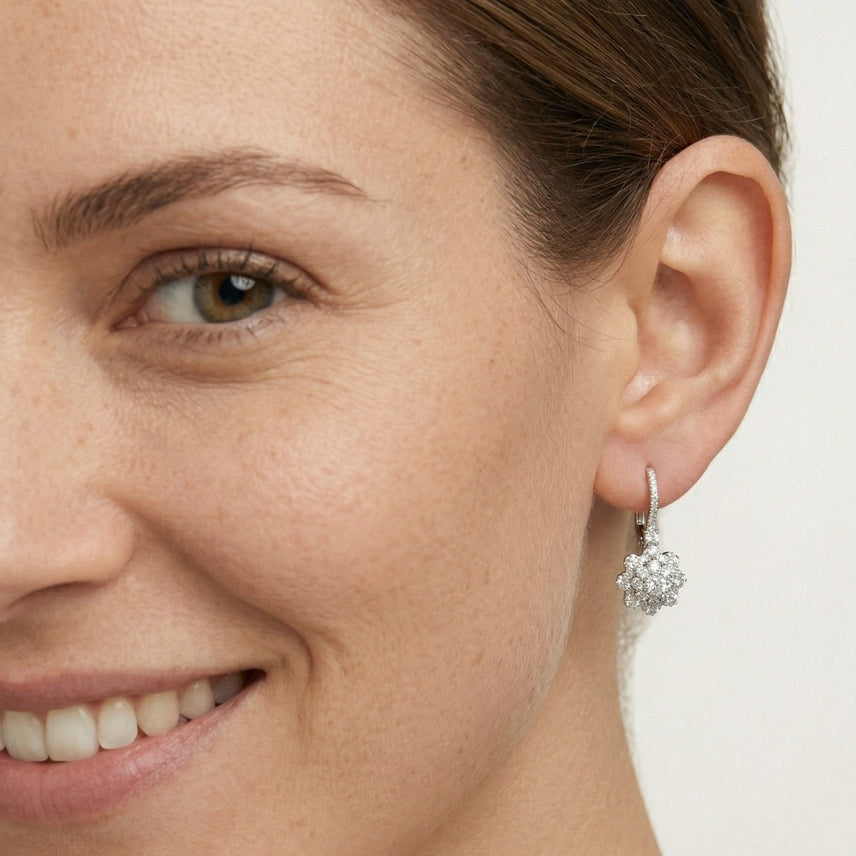 Faszinierende Blumen-Ohrringe, handgefertigt aus 14K Weißgold, verziert mit 84 brillantgeschliffenen Diamanten.