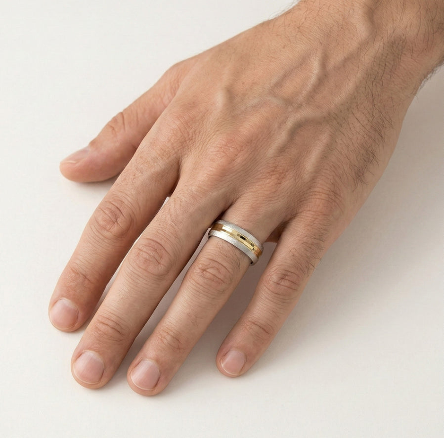 Dieser 6 mm breite Trauring vereint die Eleganz von 14 Karat Weiß- und Gelbgold. Das Design besticht durch eine klassische runde Form mit einer markanten Linie aus Gelbgold, die das Band umgibt, ergänzt durch mattierte Seiten aus Weißgold. Perfekt gefertigt für Damen und Herren, die klassischen Stil mit moderner Raffinesse verbinden möchten.