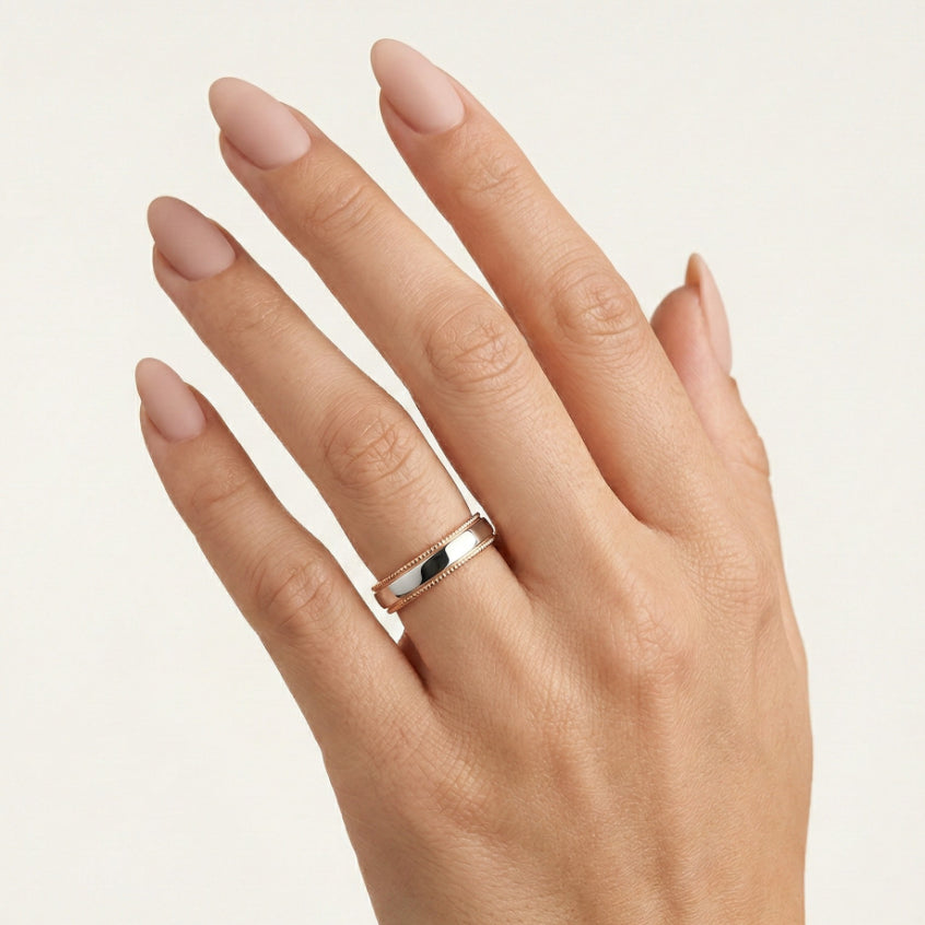 Entdecken Sie exquisite 14-karätige Eheringe aus Roségold und Weißgold mit hochglanzpolierter Oberfläche und einzigartigem seitlichem Detail in einer Dicke von 5 mm. Diese Ringe verfügen über eine klassische runde Form und bieten eine perfekte Mischung aus Eleganz und filigraner Handwerkskunst, was sie sowohl für Männer als auch für Frauen ideal macht.