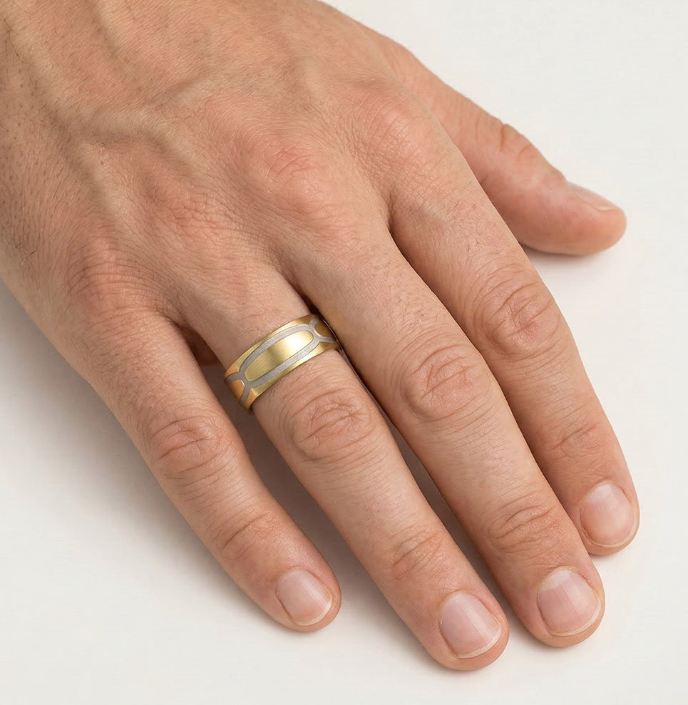 Dieser markante Trauring aus 14 kt Weiß- und Gelbgold ist für Damen und Herren gestaltet und verfügt über ein 7 mm breites, steinloses Band. Das außergewöhnliche Design zeigt filigrane Details und macht ihn zu einem besonderen Schmuckstück. Perfekt für Paare, die einen mutigen und eleganten Look suchen, bietet dieser Ring eine moderne Interpretation klassischer Eleganz.