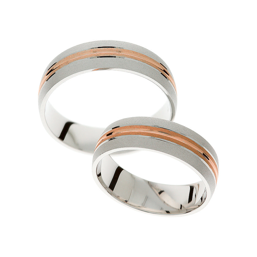 Dieser Ehering für Damen und Herren besticht durch ein einzigartiges Design aus 14 K Weiß- und Roségold. Das Weißgold ist mattiert, das Roségold hochglanzpoliert. Mit einer Stärke von 6 mm und der charakteristischen Kombination der Oberflächen ist der Ring ideal für einen modernen und eleganten Look.
