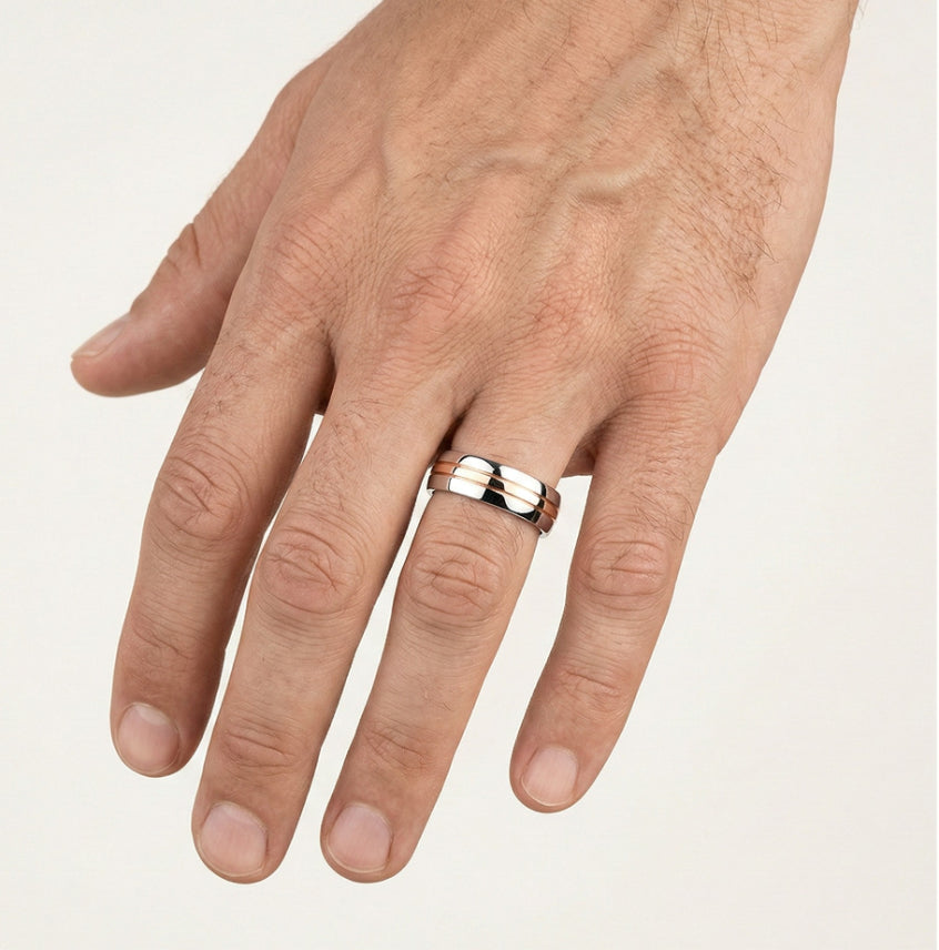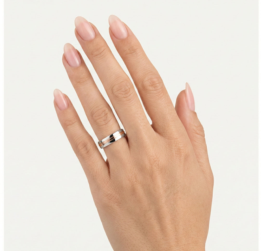 Dieser Ehering für Männer und Frauen ist aus 14kt Weiß- und Roségold gefertigt. Das einzigartige Design zeigt Weißgold an den Seiten und Roségold in der Mitte, alles in einer hochglanzpolierten Oberfläche. Mit einer Dicke von 6 mm vereint er Eleganz und Stil und ist perfekt für Paare.