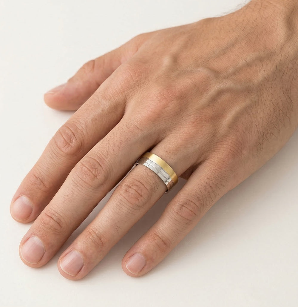 Dieser elegante Ehering ist für Damen und Herren gefertigt und besticht durch eine einzigartige Kombination aus 14 Karat Gelb- und Weißgold. Mit einer Stärke von 7 mm und hochglänzendem Finish bietet dieser Ring einen raffinierten und modernen Look. Die nahtlose Verbindung der beiden Goldtöne verleiht ihm einen markanten Stil und macht ihn zur perfekten Wahl für Paare, die ein zeitloses und zugleich modernes Design ohne Steine wünschen.