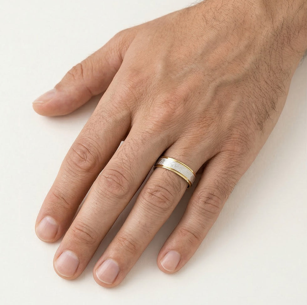 Dieser exquisite 14kt Trauring für Damen und Herren vereint Gelb- und Weißgold auf einzigartige Weise. Das 5 mm breite Band zeigt eine hochglanzpolierte Gelbgoldbasis mit mattiertem Weißgold auf der Oberseite und schafft so einen beeindruckenden Kontrast. Perfekt für alle, die ein stilvolles, modernes Design ohne Steine suchen, symbolisiert dieser Ring dauerhafte Liebe und Verbundenheit.