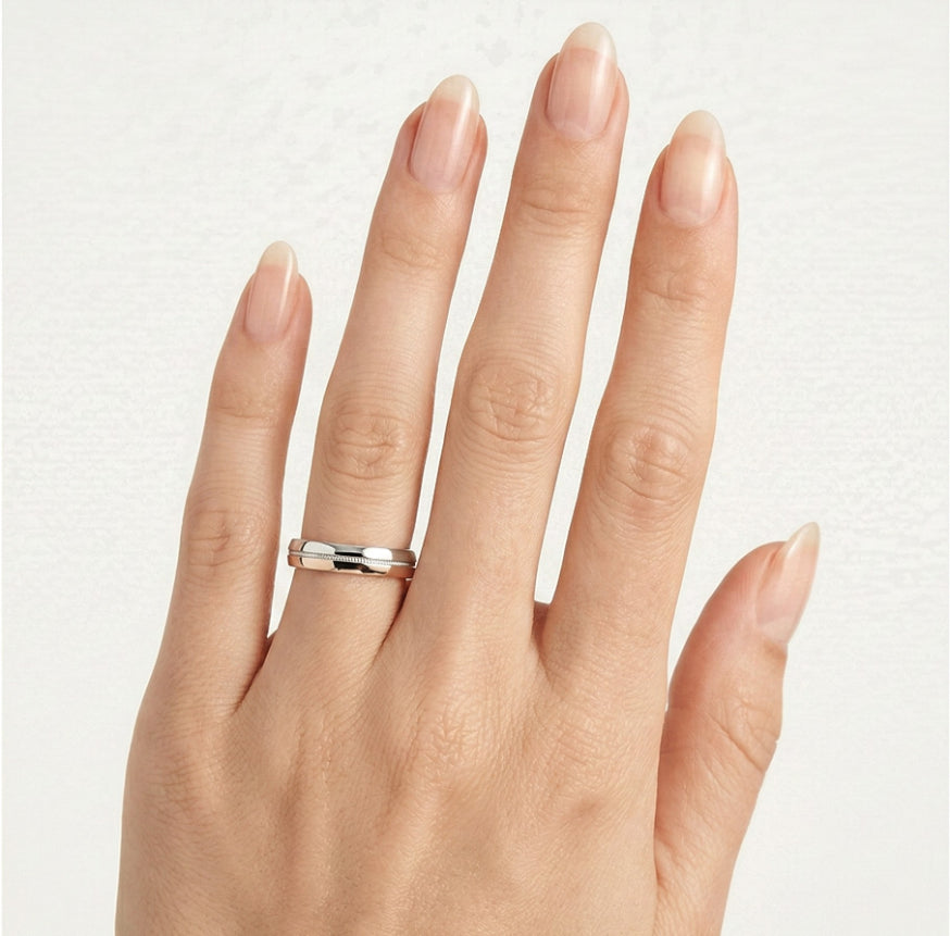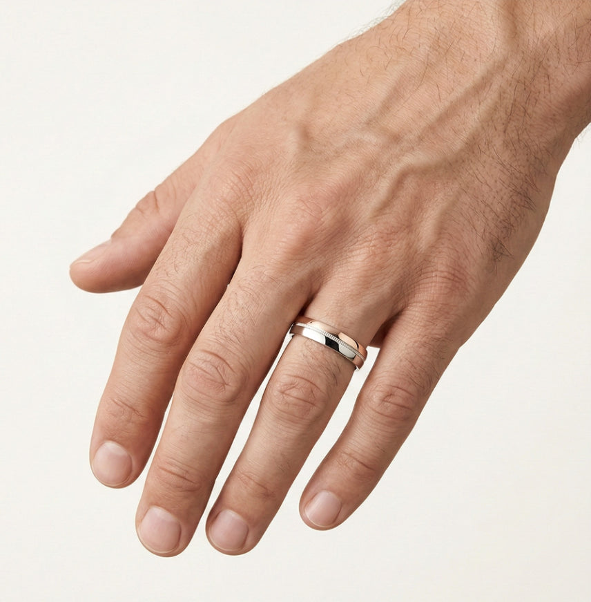 Feiern Sie Ihre Verbindung mit diesen klassischen Eheringen für Männer und Frauen, gefertigt aus 14-karätigem halb Roségold und halb Weißgold. Mit einer hochpolierten Oberfläche und einer interessanten Gestaltung in der Mitte bieten diese 5 mm dicken Ringe mit einer klassischen runden Form eine perfekte Kombination aus Tradition und moderner Eleganz.