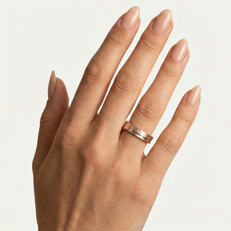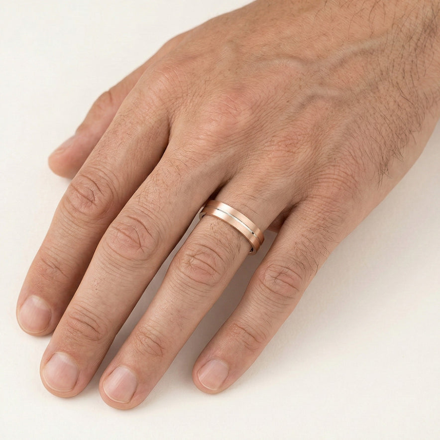 Wunderschöne 14-karätige Eheringe aus Roségold und Weißgold für Männer und Frauen. Einer der Ringe ist mit einem Solitär-Zirkonia oder Diamanten im Gesamtgewicht von 0,01 ct in einer runden feinen Stufenfassung und einer Zargenfassung versehen. Der zweite Ring ist schlicht. Beide Ringe haben ein einzigartiges Design mit einer umlaufenden Weißgoldlinie in hochpolierter Ausführung und einer Dicke von 4 mm.
