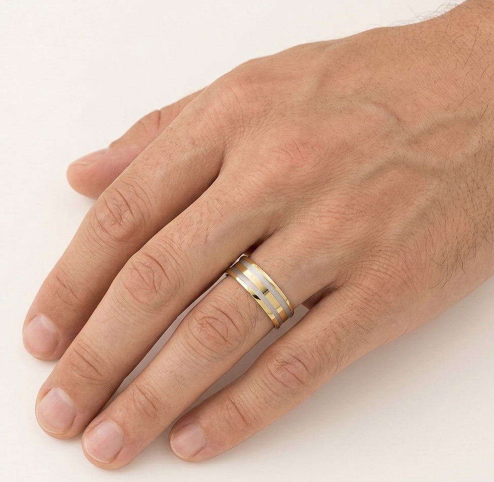 Dieser elegante Ehering für Damen und Herren besticht durch ein einzigartiges Design aus 14 Karat Gelb- und Weißgold. Mit einer hochglanzpolierten Oberfläche und einem speziellen Schliff ist das Band 7 mm dick und bietet einen stilvollen und anspruchsvollen Look. Ideal für diejenigen, die einen zeitlosen und einzigartigen Ehering ohne Steine suchen.