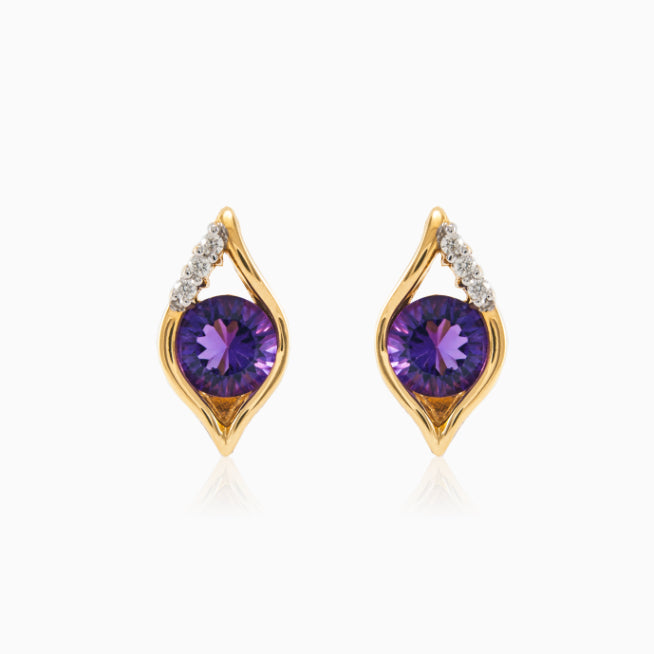 Ohrringe mit Amethyst in 18 Karat Gelbgold mit Diamanten. Wunderschöner, natürlich geschliffener Amethyst. Jedes dieser eleganten Ohrringe ist mit drei funkelnden Diamanten verziert. Das schöne und kreative Design macht dieses Schmuckstück zum perfekten Begleiter für viele Anlässe.