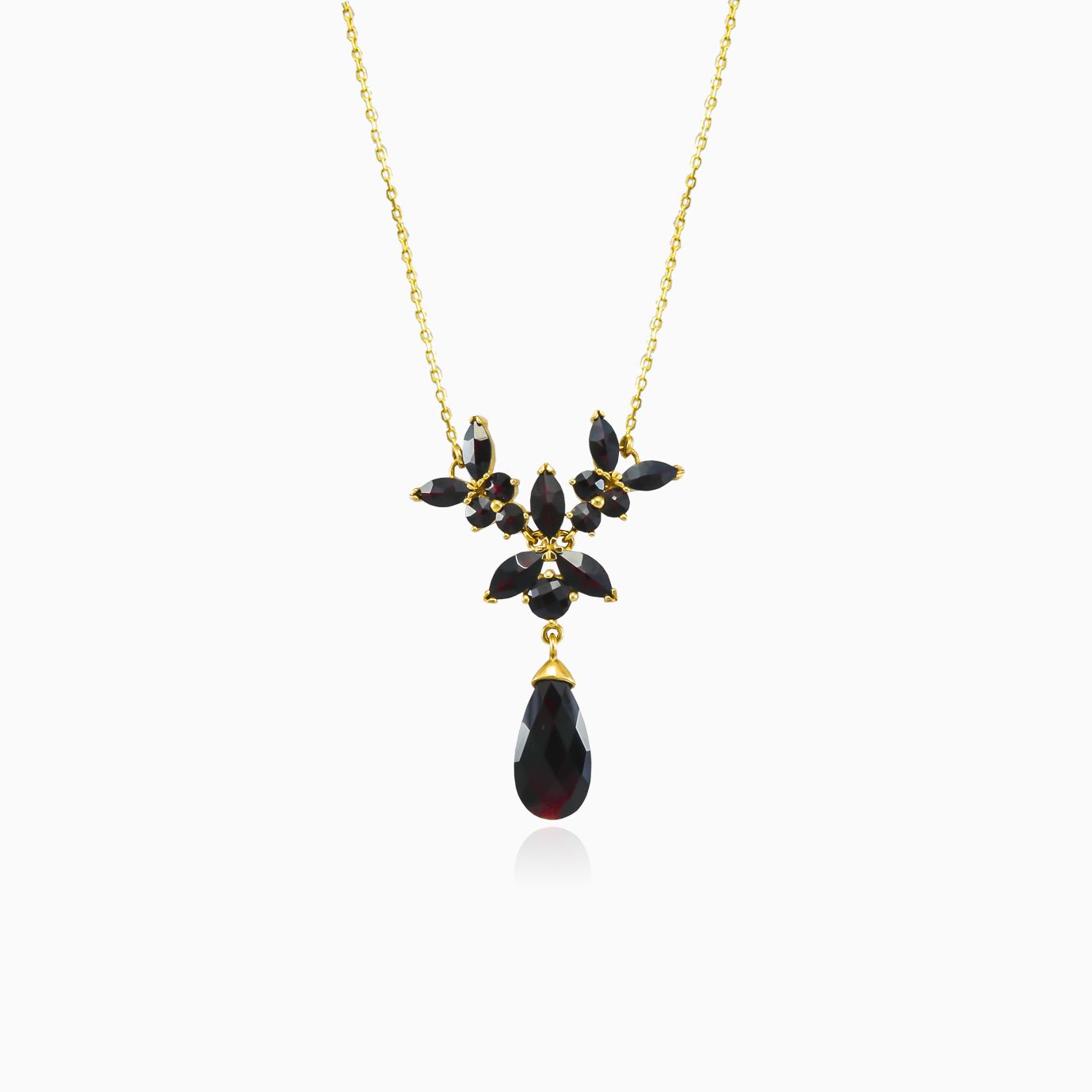 Faszinierende Halskette, handgefertigt aus 14K Gold mit marquis-, rund- und tropfenförmig geschliffenen Granaten.