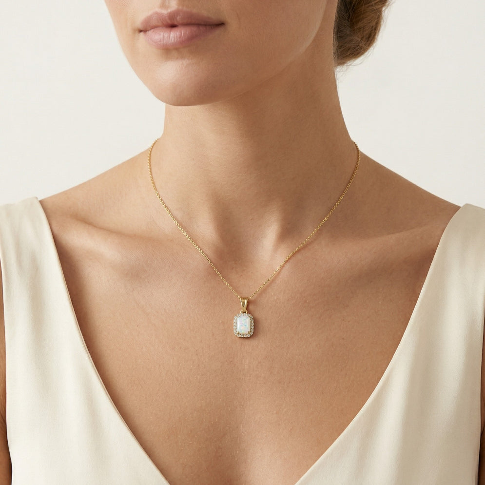 Wunderschöner klassischer Anhänger aus 14 Karat Gold mit einem Halo aus runden Zirkonia, die einen rechteckigen Cabochon-Opal umrahmen.