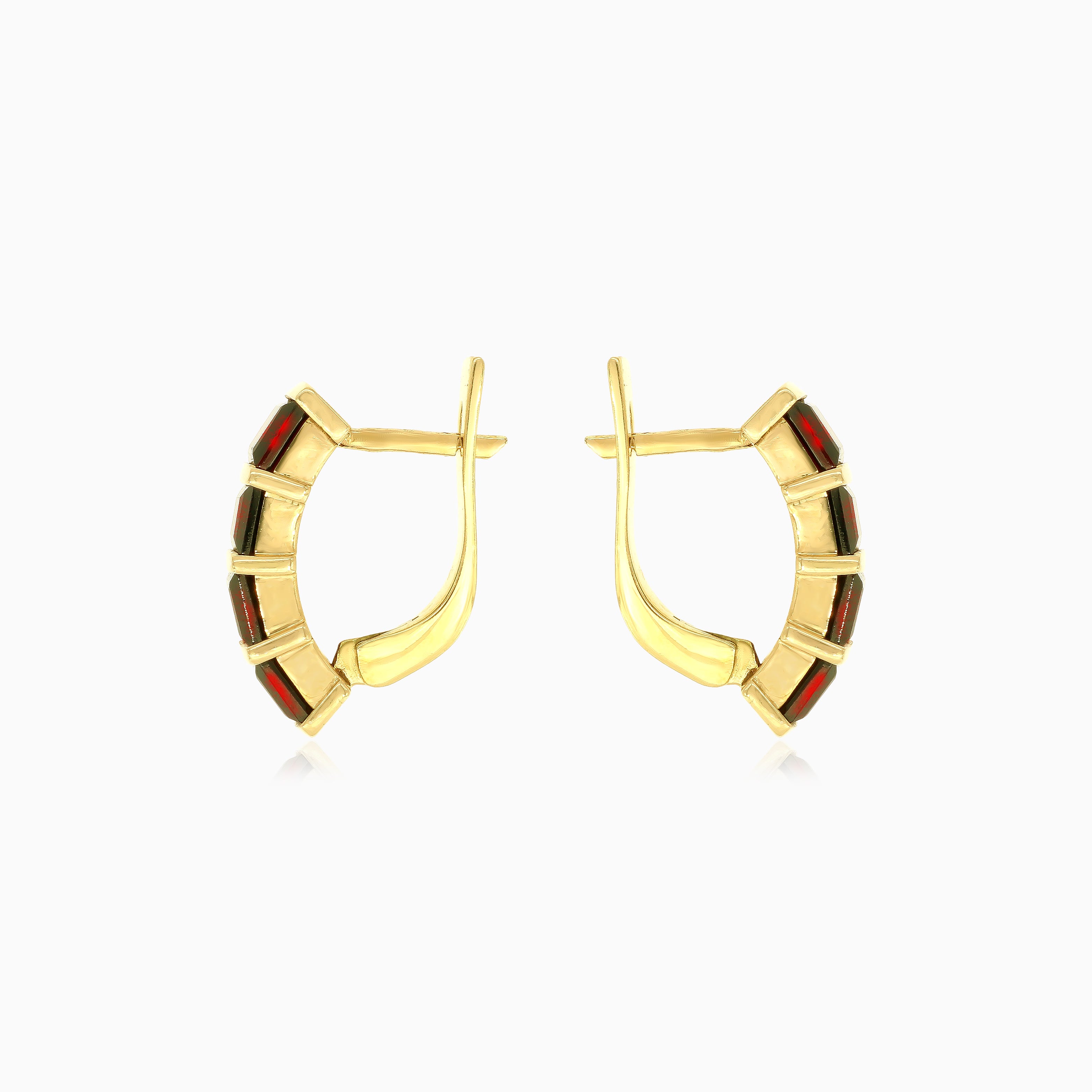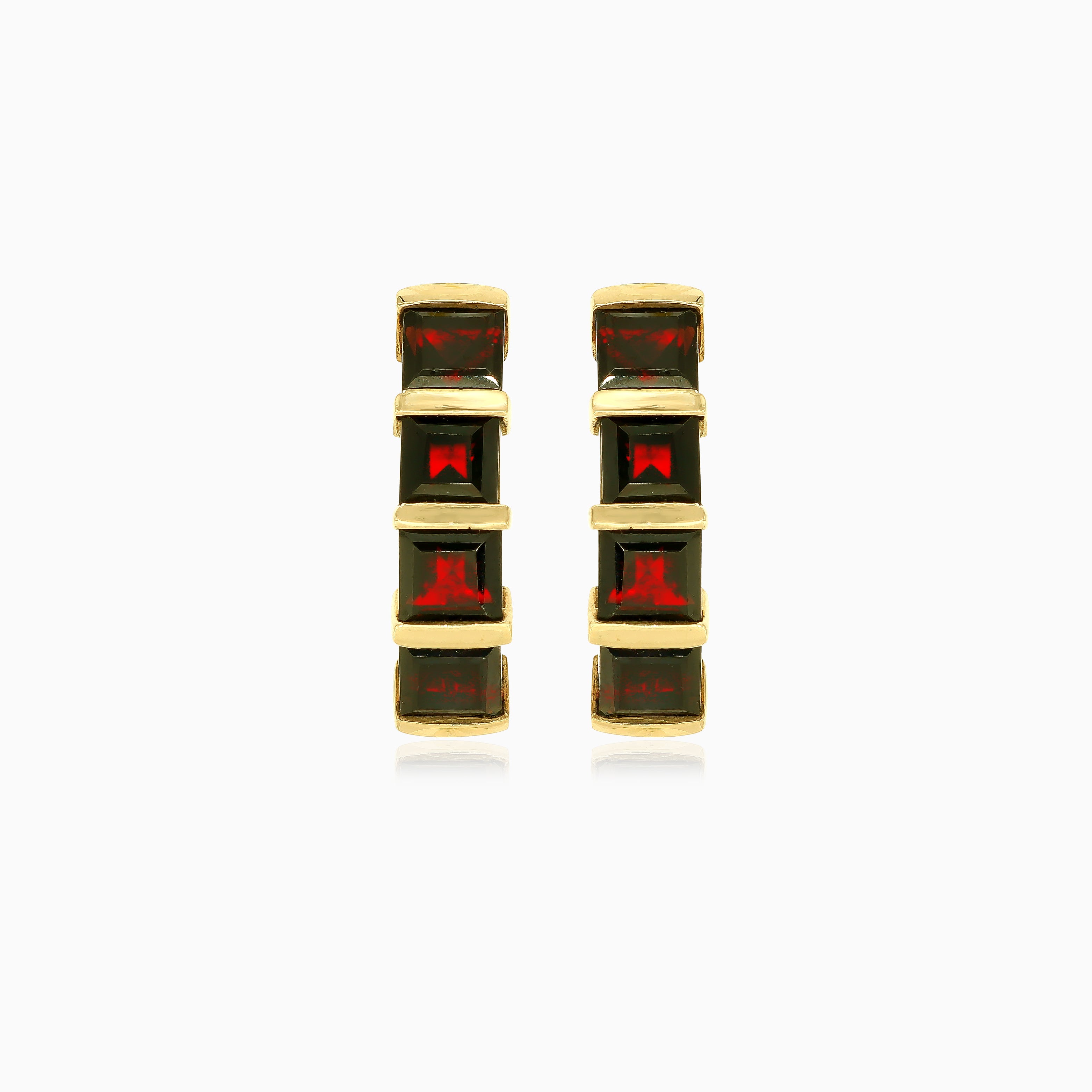 Breite Ohrringe aus Gold mit quadratisch geschliffenen Granat-Steinen im Prinzessschliff