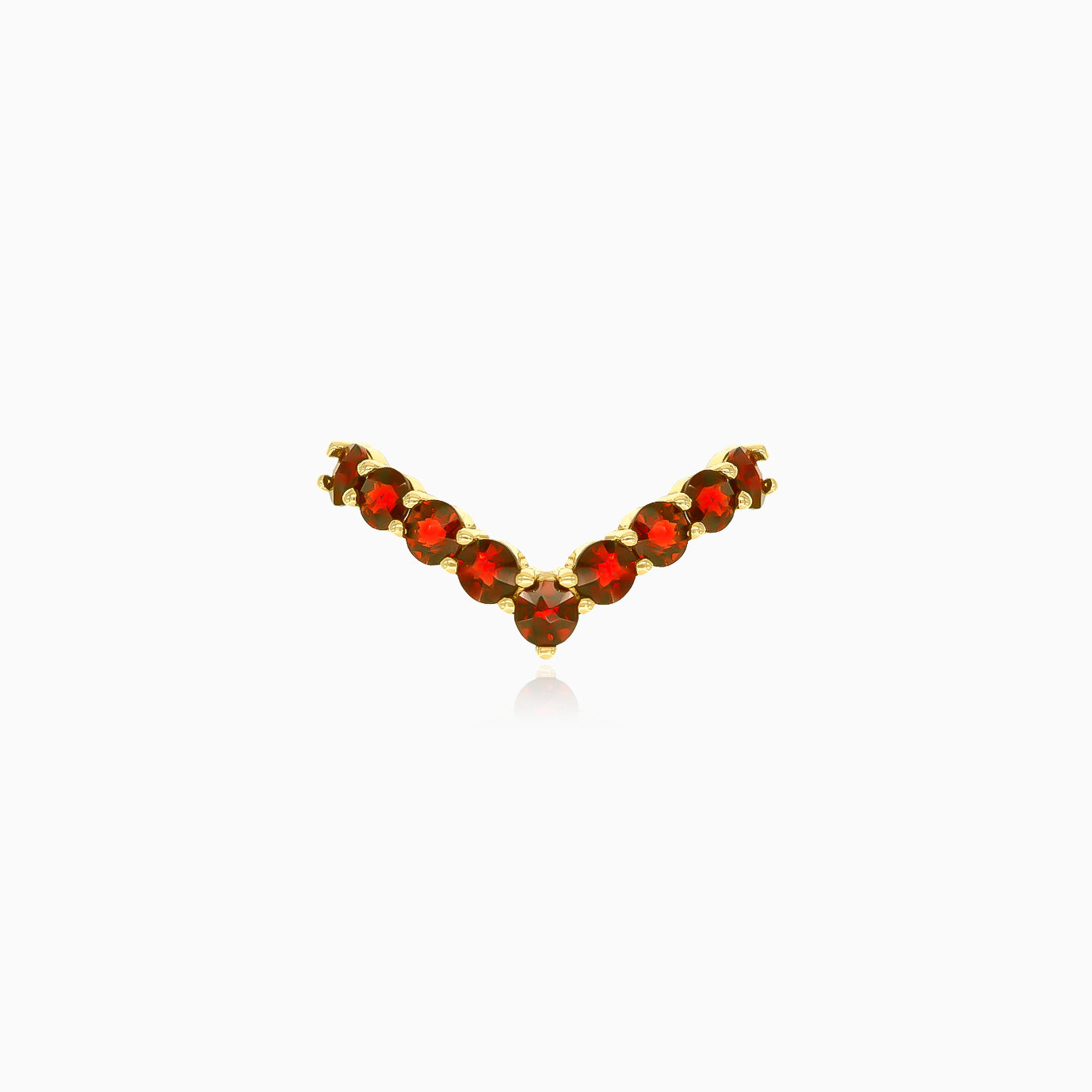 Dieser elegante Damenring verfügt über ein 14kt Gelbgold-Band in schlanker V-Form, das einen rund fein stufig geschliffenen Granat in sicherer Krappenfassung hervorhebt. Das einzigartige Design und der lebendige Edelstein machen ihn zur idealen Wahl, um jedem Look einen Hauch von Raffinesse zu verleihen.
