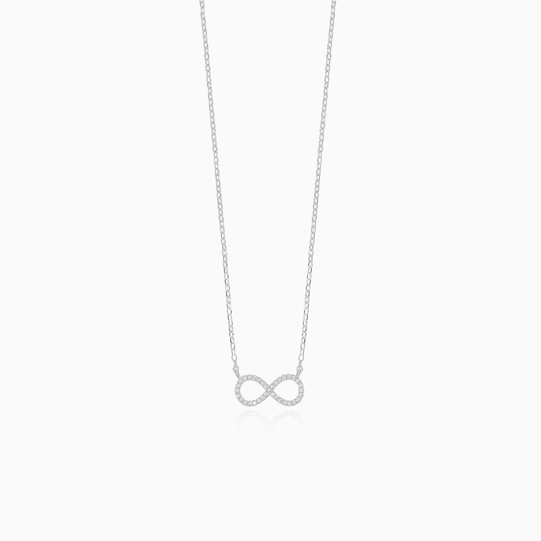 Diese elegante Damen-Halskette aus Sterling Silber zeigt ein Infinity-Design mit funkelnden Zirkonia-Steinen im runden feinen Stufenschliff in Krappenfassung. Das Schmuckstück symbolisiert zeitlose Liebe und Unendlichkeit. Ein Federringverschluss sorgt für sicheren und bequemen Sitz.