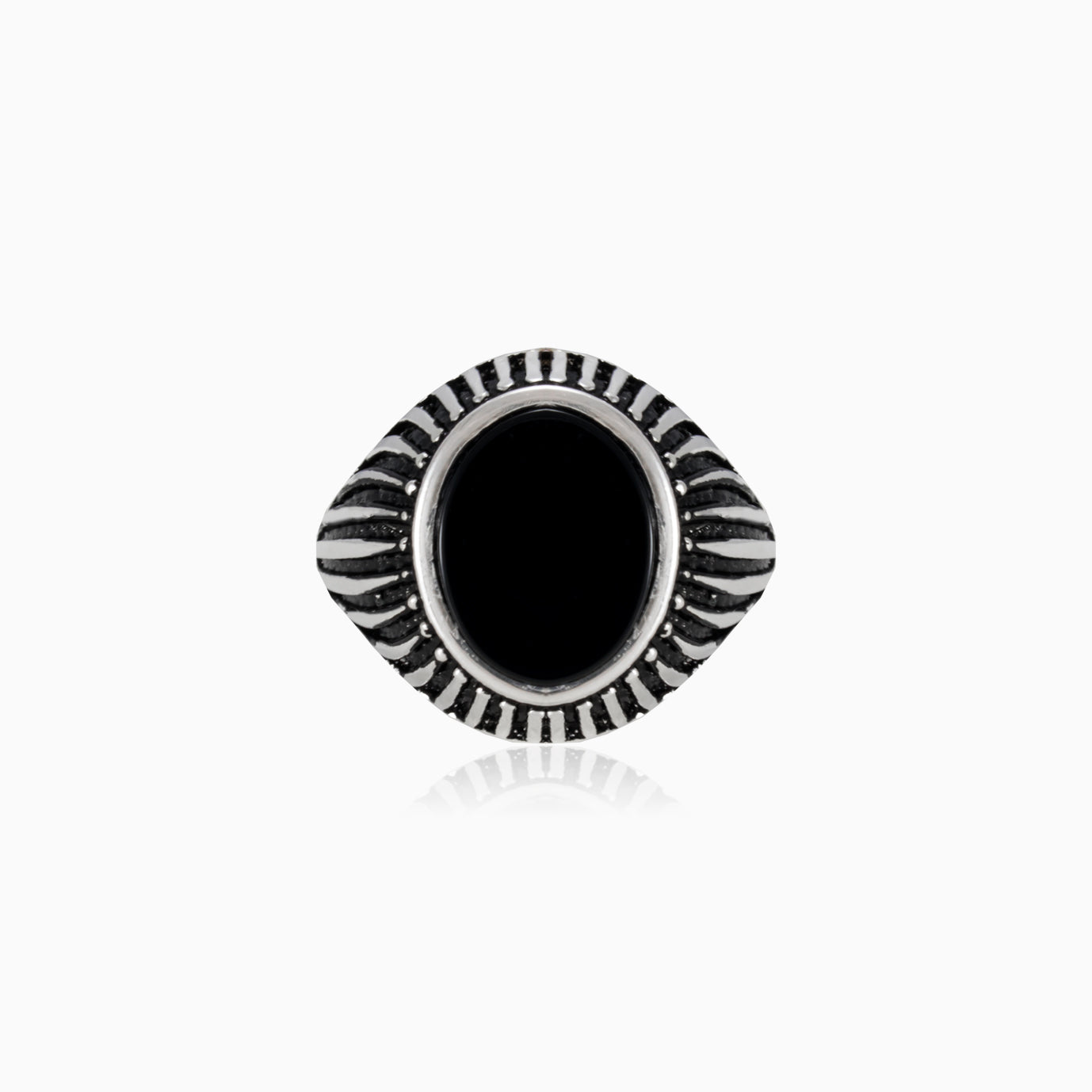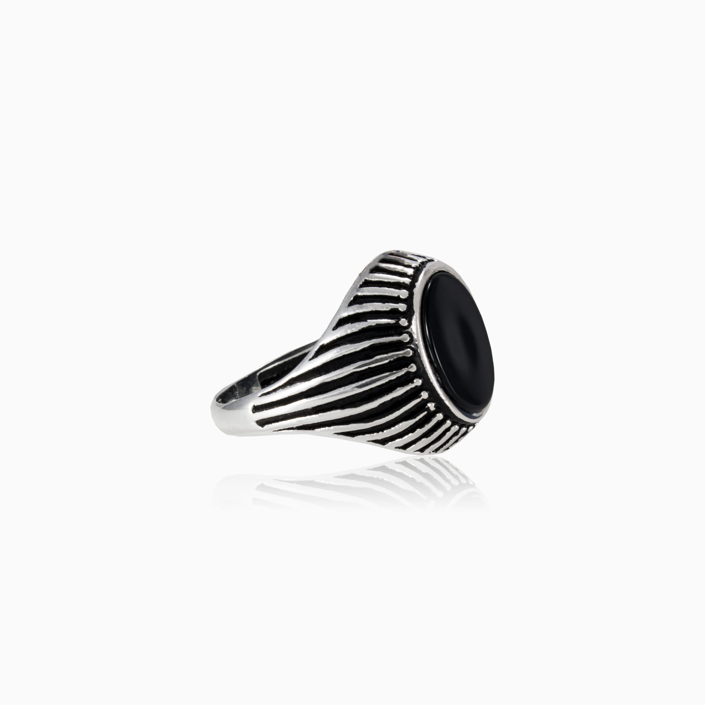 Pánský prsten s oválným onyxem a bočními liniovými detaily