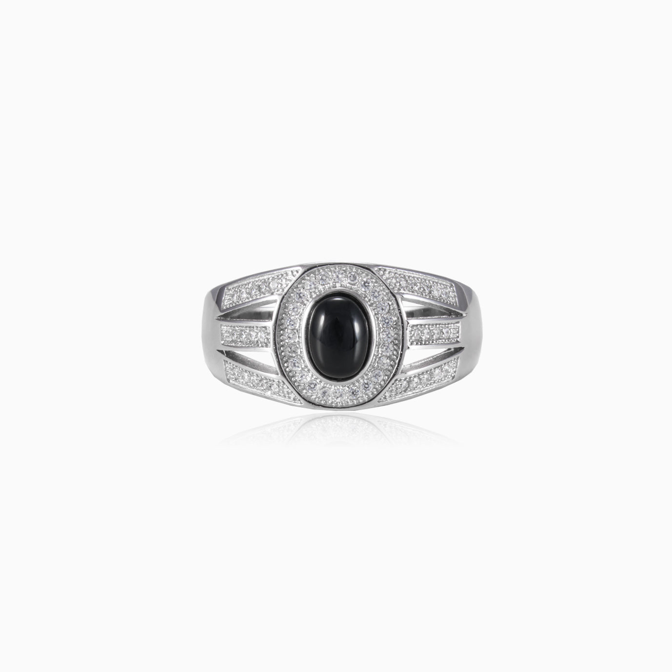 Tento pánský prsten ze stříbra zdobí oválný onyx zasazený do elegantního halo rámečku, který zvýrazňuje jeho hluboký tmavý tón. Precizní zpracování a hladké linie dodávají šperku moderní a sebevědomý vzhled. Ideální doplněk pro muže, kteří hledají výrazný a sofistikovaný šperk.