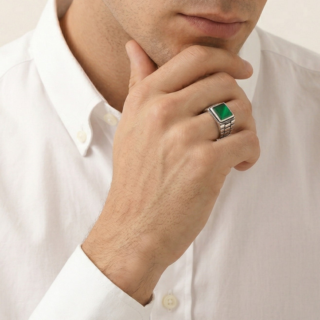 Tento stříbrný solitaire prsten vyniká princess výbrusem jadeitu, který dodává šperku sofistikovaný lesk a výrazný charakter. Minimalistický design podtrhuje osobitý styl každého muže — ideální pro sebevědomé okamžiky i každodenní eleganci.