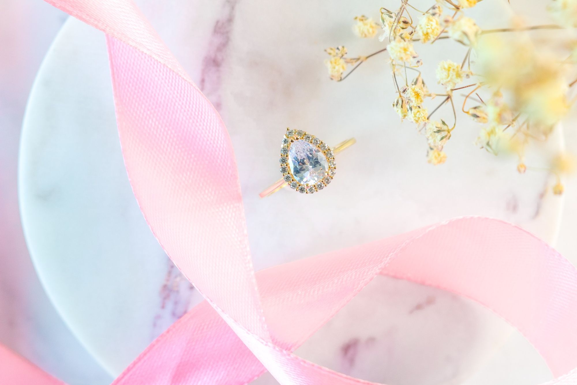 Royaler 14K Gelbgold-Ring mit birnenförmigem Zirkonia und Halo aus Zirkonia.