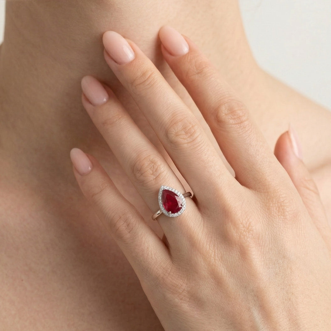 Dieser atemberaubende Halo-Ring aus Sterlingsilber präsentiert einen synthetischen Rubin im Zentrum, geschliffen im feinen tropfenförmigen Treppenschliff. Rund um den lebendigen Rubin funkeln Zirkoniasteine im runden feinen Facettenschliff und verleihen zusätzlichen Glanz. Die Krappenfassung hält jeden Stein sicher und schafft ein zeitloses, elegantes Design – ideal für besondere Anlässe.