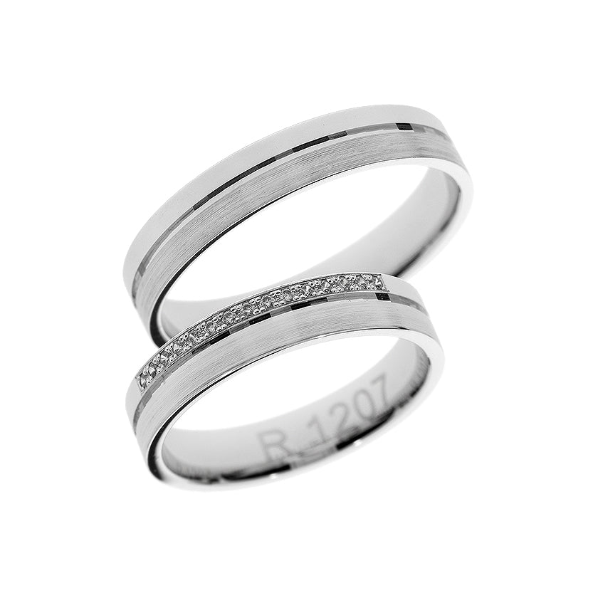 Dieser 14 Karat Weißgold-Ehering für Damen und Herren zeigt ein 4 mm breites Band mit einer Kombination aus halb mattem und hochglänzendem Finish. Er ist in schlichter Ausführung oder mit funkelndem 0,075 ct rundem Zirkonia oder Diamanten in Krappenfassung erhältlich und bietet zeitlose Eleganz für Ihren besonderen Tag.