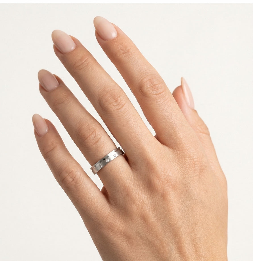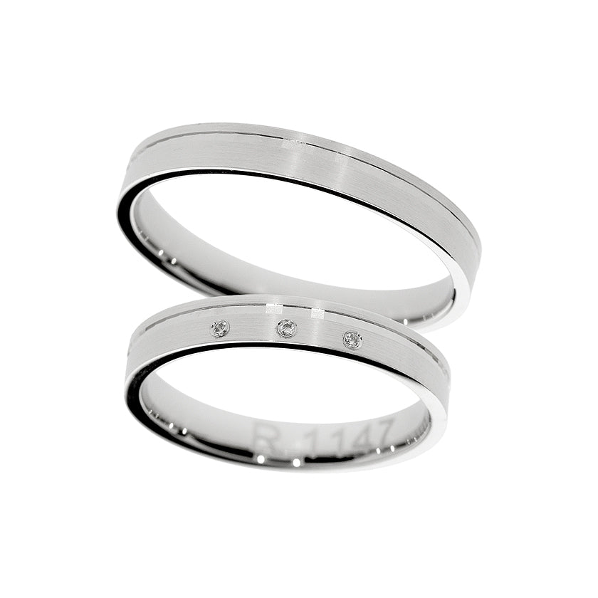 Weißgold-Trauring mit flacher, polierter Linie und Steinen