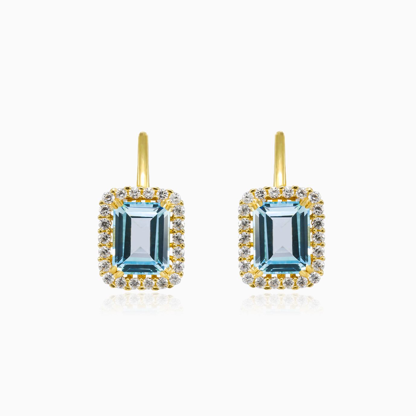 Halo-Ohrringe aus Gold mit blauem Topas im Smaragdschliff