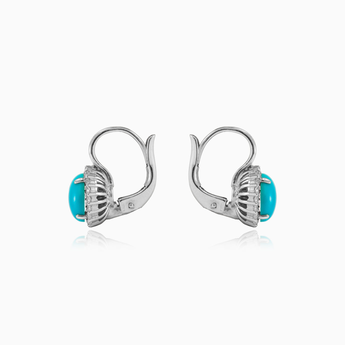 Diese eleganten Damen-Ohrhänger sind aus 14 Karat Weißgold gefertigt und zeigen einen ovalen Türkis-Cabochon in einer glatten Krappenfassung mit rundem, fein treppenförmig geschliffenem Zirkonia. Der Klappverschluss sorgt für sicheren und bequemen Sitz. Ein schlichtes, aber auffälliges Design für tägliche Eleganz.