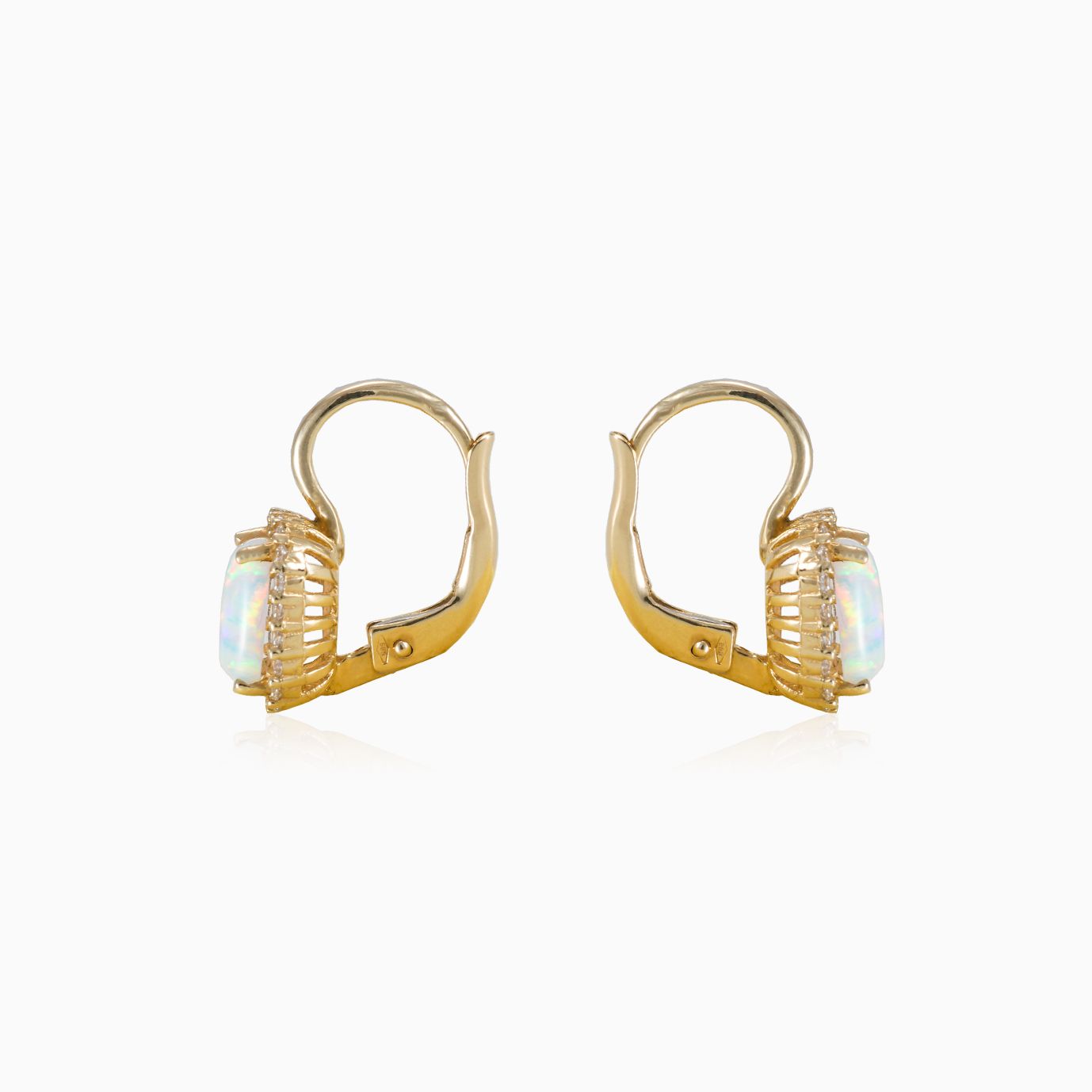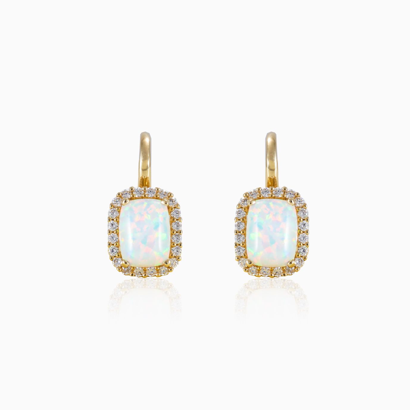 Schöne klassische Ohrringe aus 14 Karat Gold mit einem Halo aus runden Zirkonia, der einen rechteckigen Cabochon-Opal umgibt.