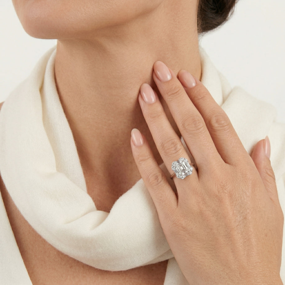Ring mit Halo aus Zirkonia im Kissenschliff und Rundschliff