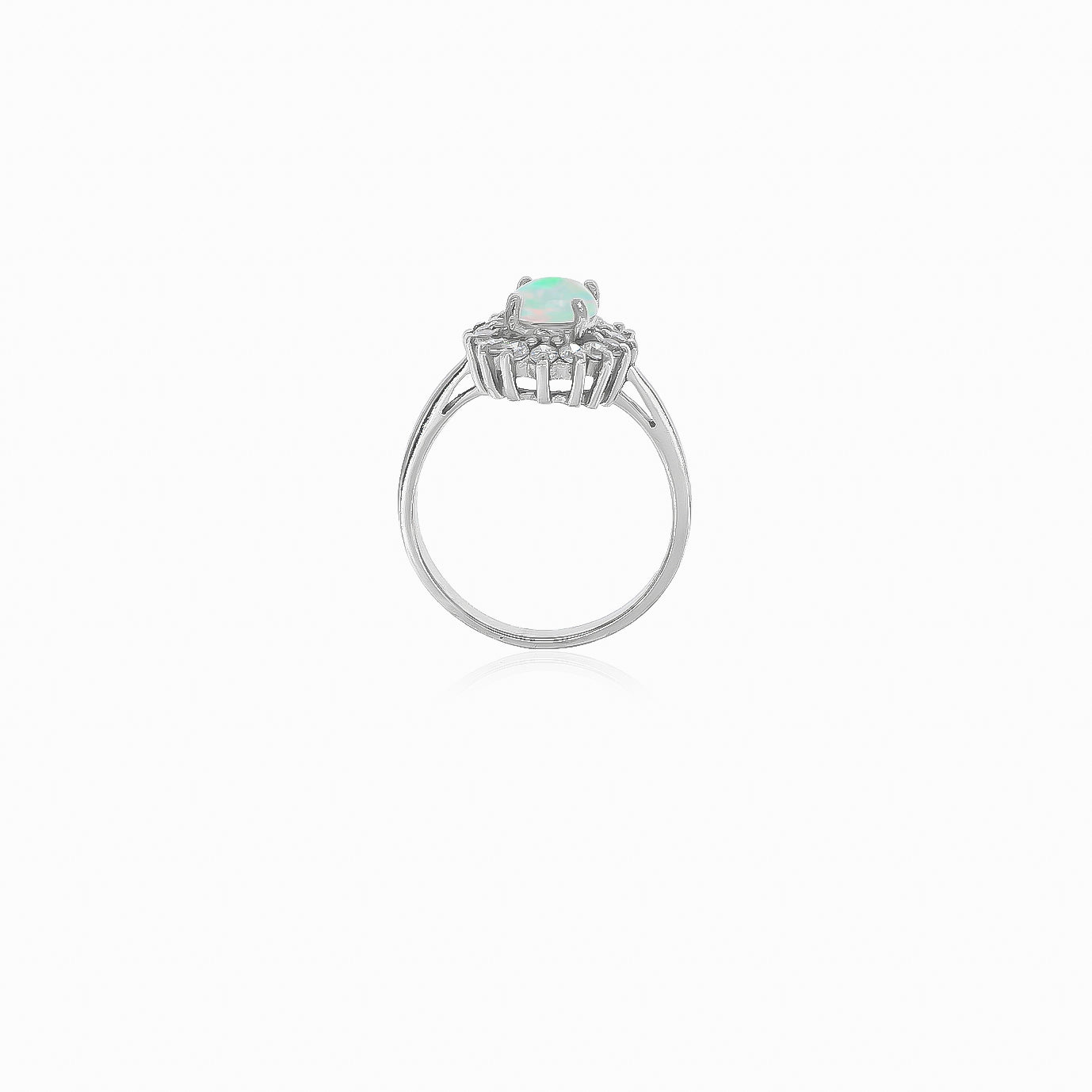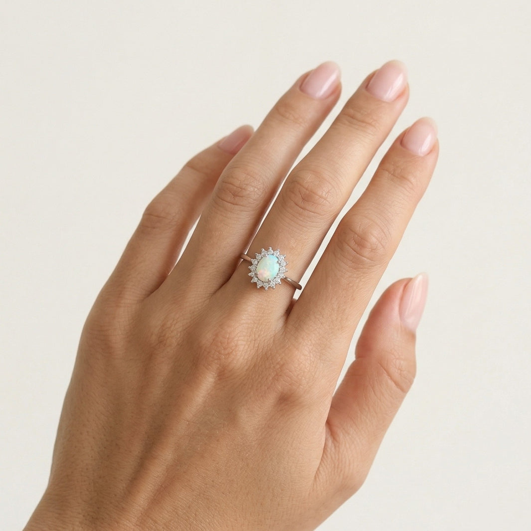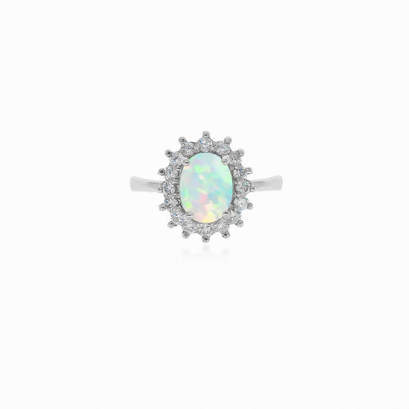 Verleihen Sie Ihrem Stil einen Hauch von Eleganz mit unserem Damenring aus Silber, der einen atemberaubenden weißen Opal im ovalen Cabochonschliff zeigt, ergänzt durch funkelnde Zirkonia im rund geschliffenen feinen Treppenschliff, alle sicher in einer Krappenfassung eingefasst.