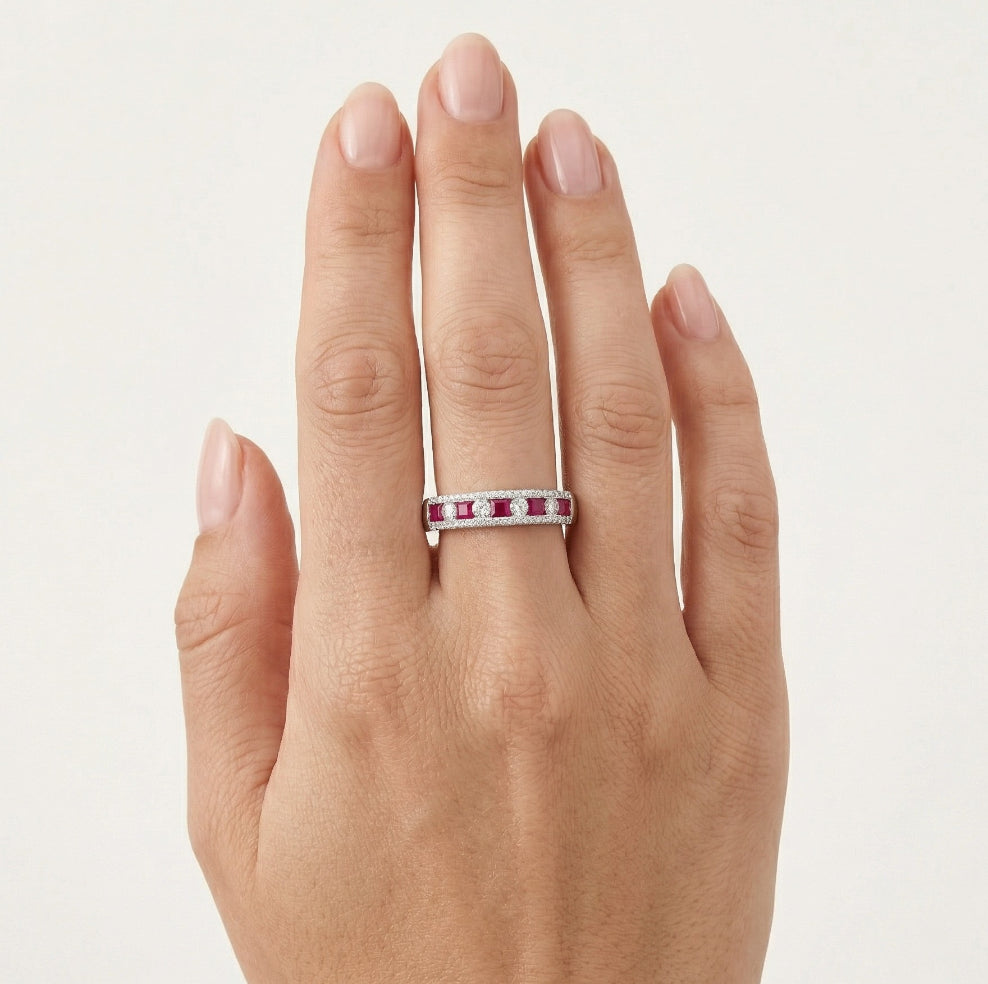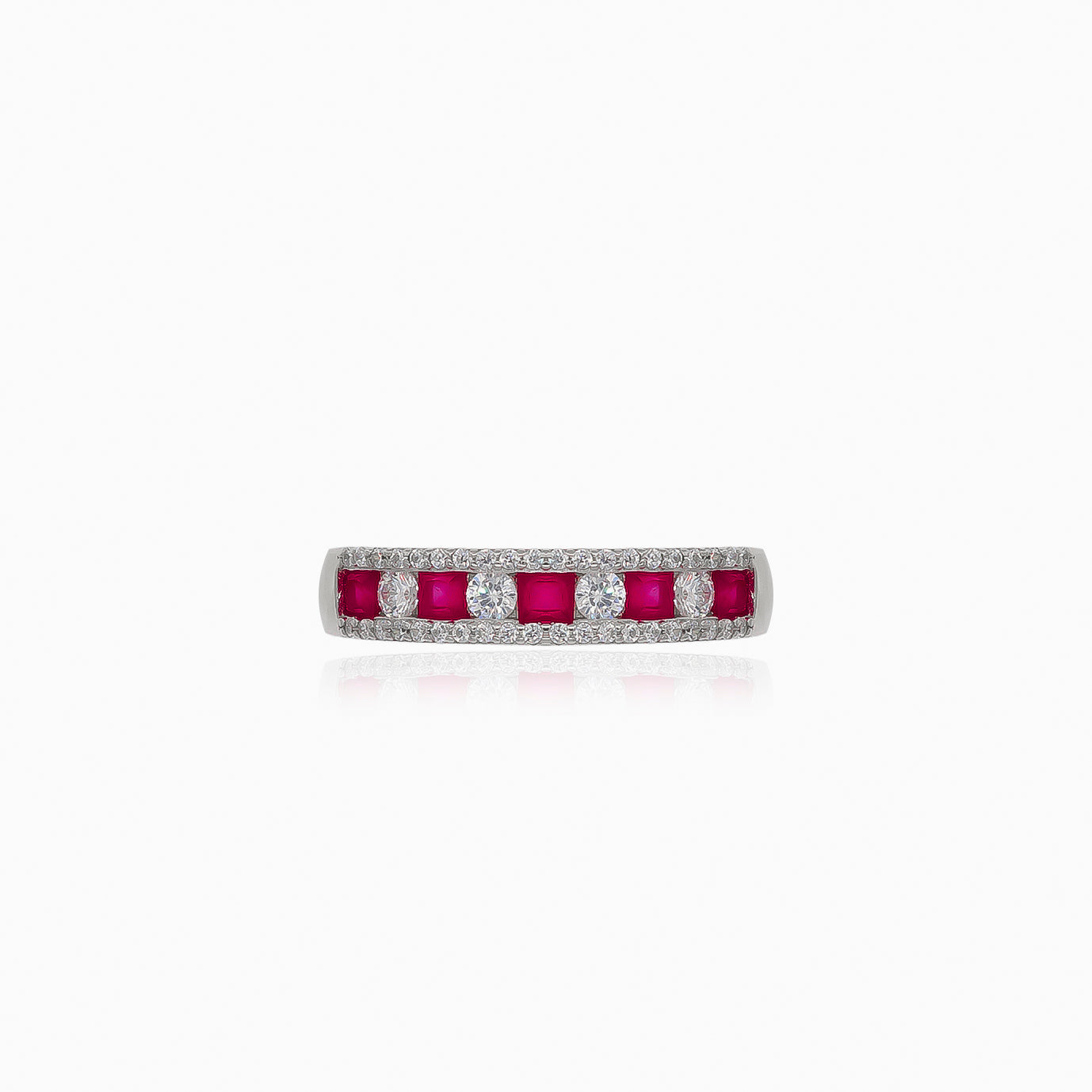 Verleihen Sie Ihrem Stil mit unserem Silberring Eleganz: Ein synthetischer Rubin im quadratischen Princess-Schliff, ergänzt durch rund facettierte Zirkonia in einer klassischen Krappenfassung.