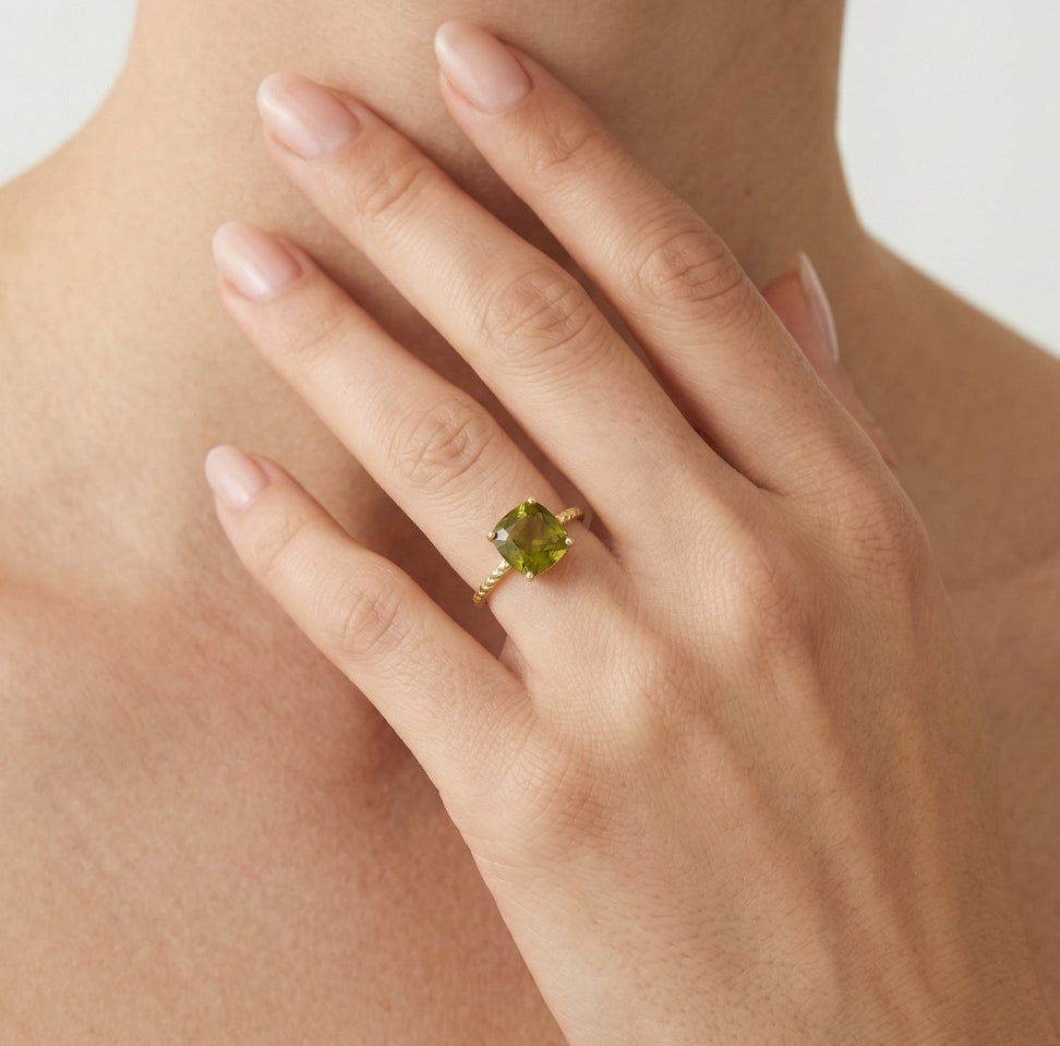 Stilvoller Goldring mit kissenförmig geschliffenem Moldavit