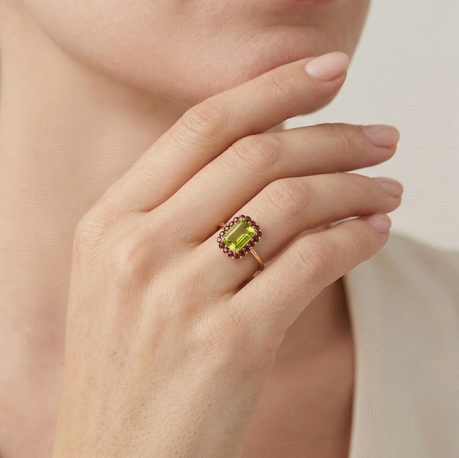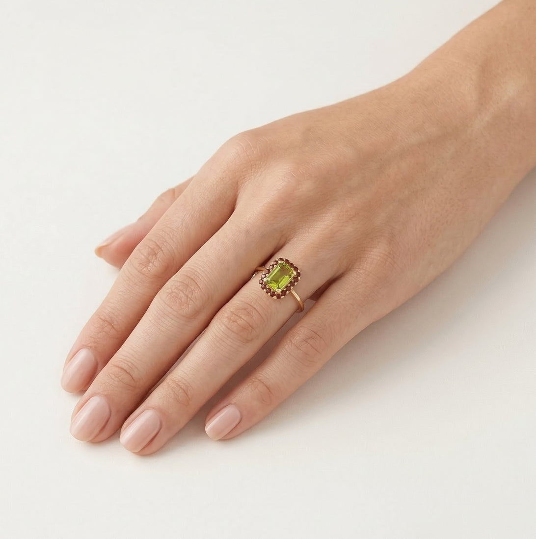Verleihen Sie Ihrem Stil mehr Glanz mit diesem Ring, der einen rechteckigen Moldavit im Radiantschliff und einen runden Granat im feinen Stufenschliff zeigt. Gefasst in einer Vier-Krappen-Anordnung aus 14 Karat Gelbgold, strahlt dieser Ring elegante Brillanz und königlichen Stil aus.