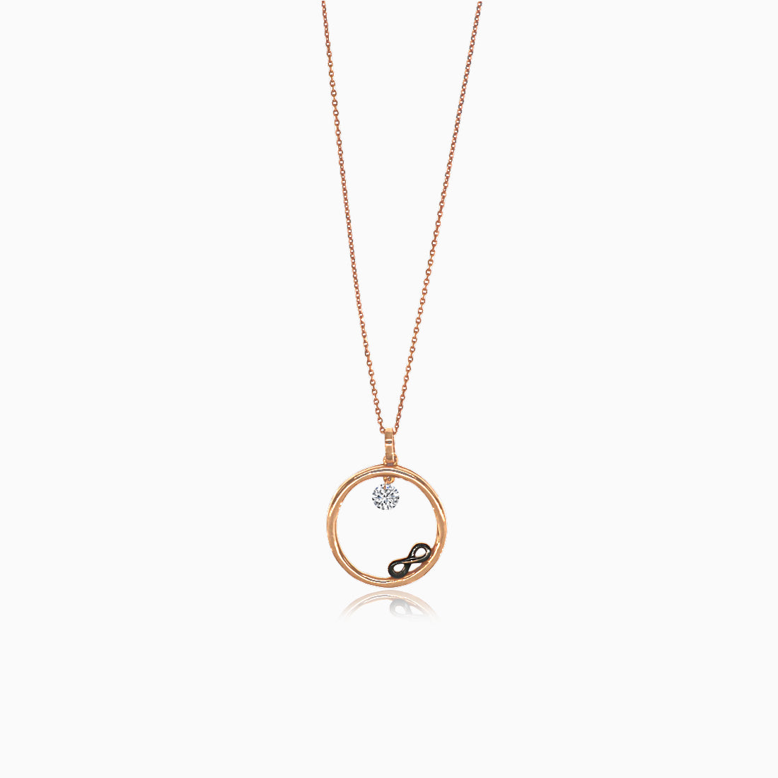 Unsere Halskette aus 18 Karat Roségold zeigt ein Pendant, das als Kreis mit einem Unendlichkeitssymbol gestaltet ist, verziert mit einem 0,11 ct SI G Diamanten. Gesichert mit einem Karabinerhaken-Verschluss.
