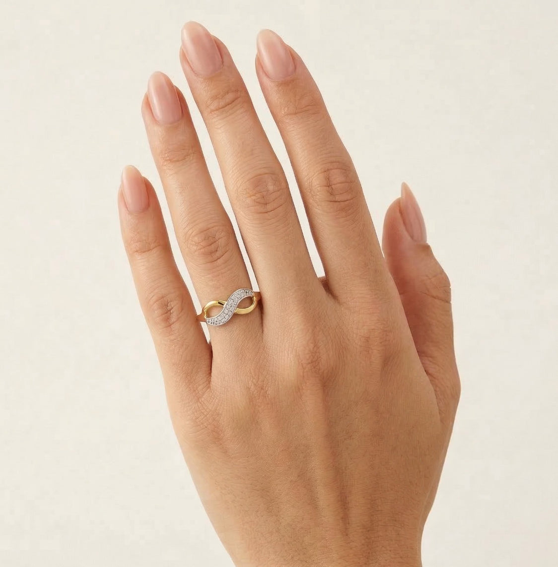 14K Unendlichkeit-Gelb- und Weißgoldring mit zwei Reihen rund geschliffener Zirkonia. Eine fesselnde Mischung aus Raffinesse und Stil.