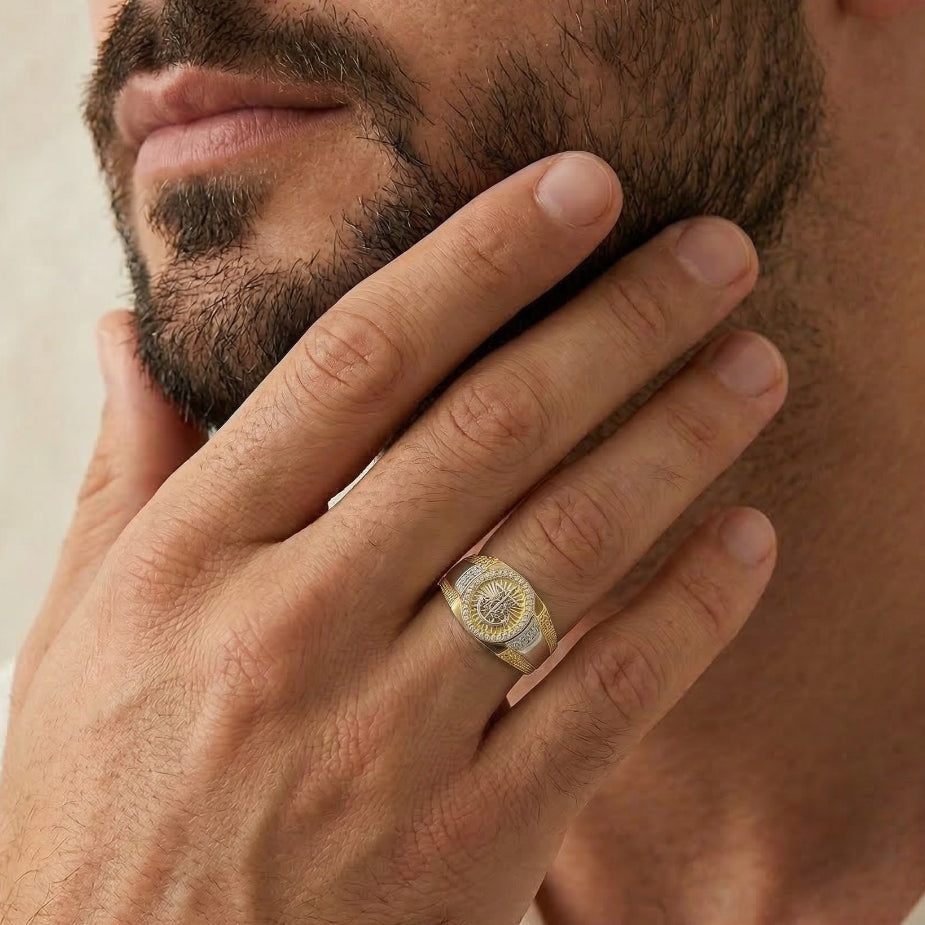 Herrenring, kunstvoll gestaltet aus der luxuriösen Fusion von 14 Karat Gelb- und Weißgold, mit einem runden, fein geschliffenen Zirkonia – eine perfekte Verbindung von Raffinesse und symbolischer Anziehungskraft.