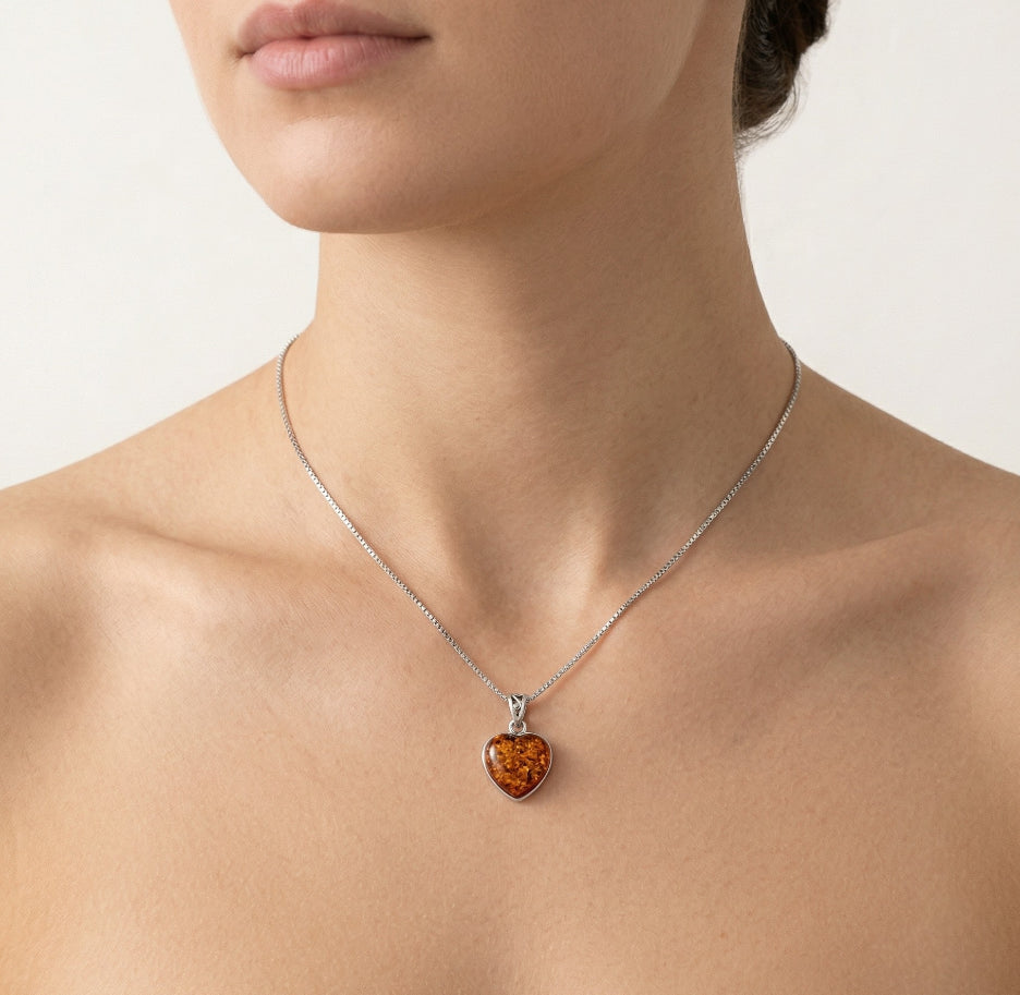 Damenanhänger aus Sterlingsilber, kombiniert mit Bernstein in Herzform.