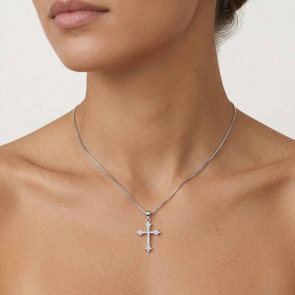 Kreuzanhänger mit Knospen-Enden aus Sterlingsilber, besetzt mit Zirkonia.