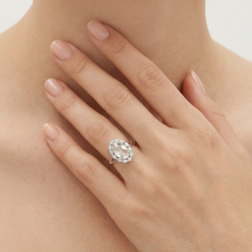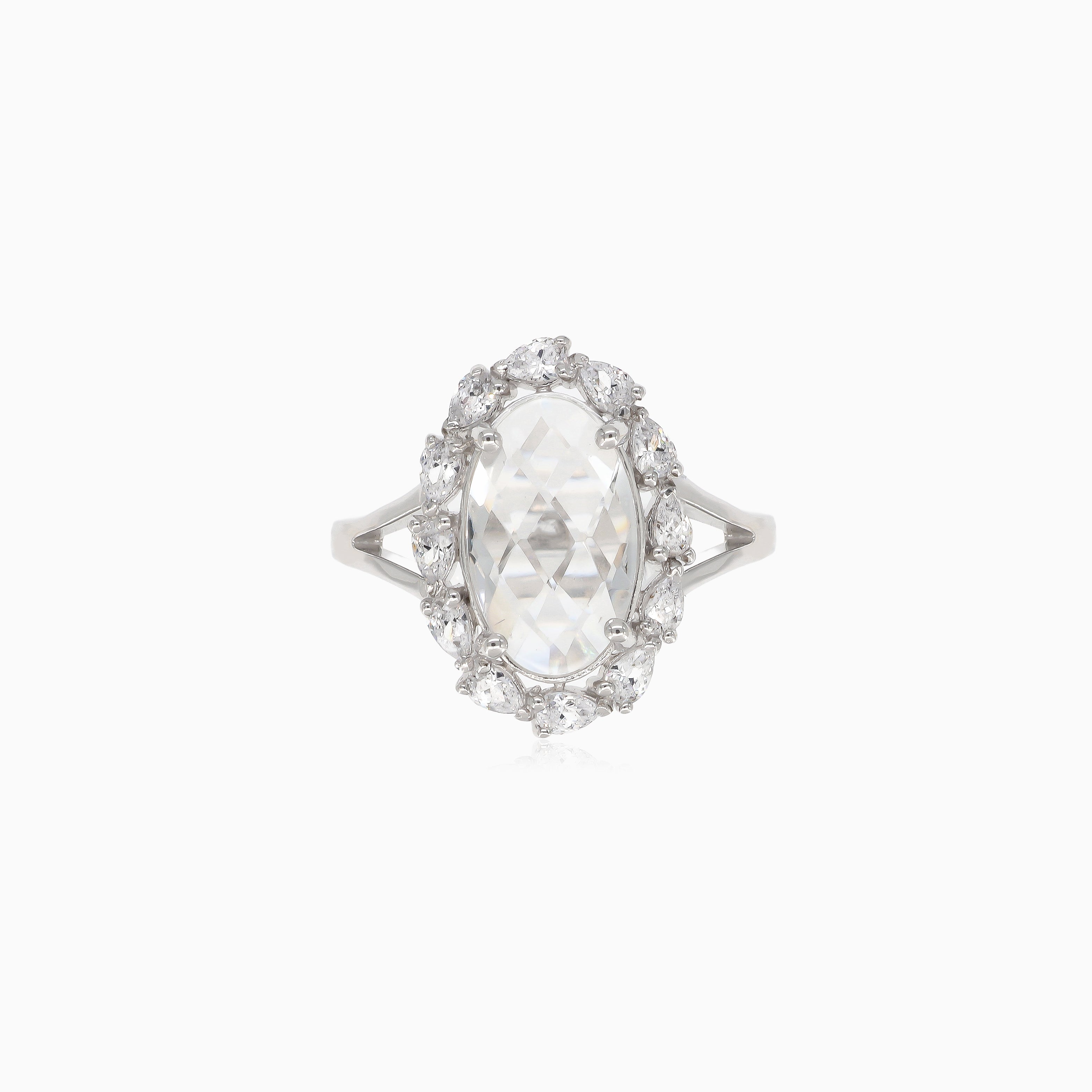 Steigern Sie Ihre Eleganz mit diesem Damenring aus Silber, der Zirkonia-Steine im Birnen- und Oval-Schliff enthält, alle zart in einer Krappenfassung gesetzt und mit einem schimmernden Halo akzentuiert.